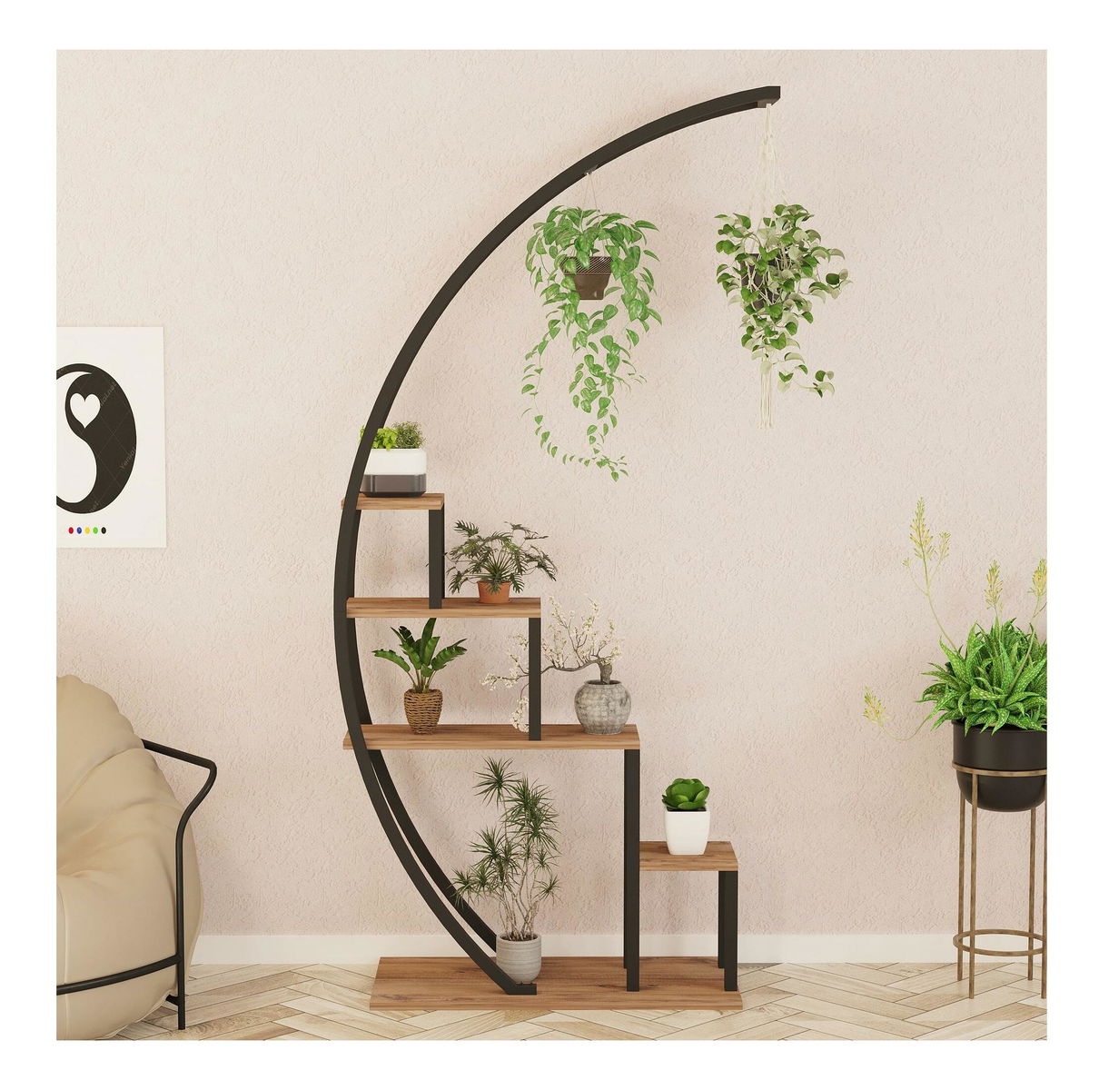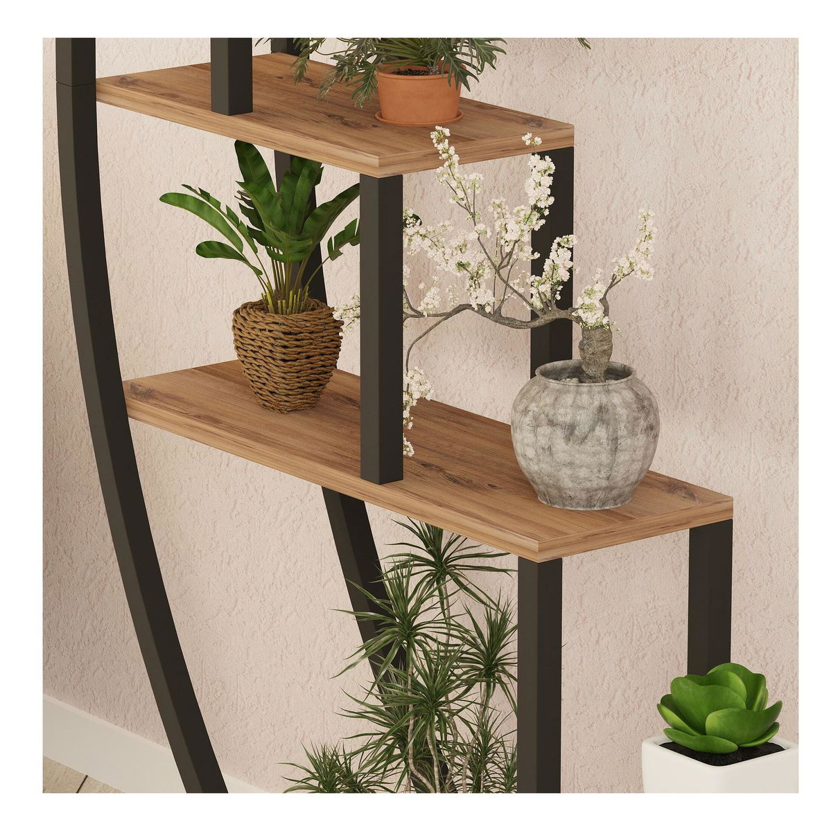 Víceúčelový zakřivený. Kovový stojan na kcětináče. Další úložné prostory.