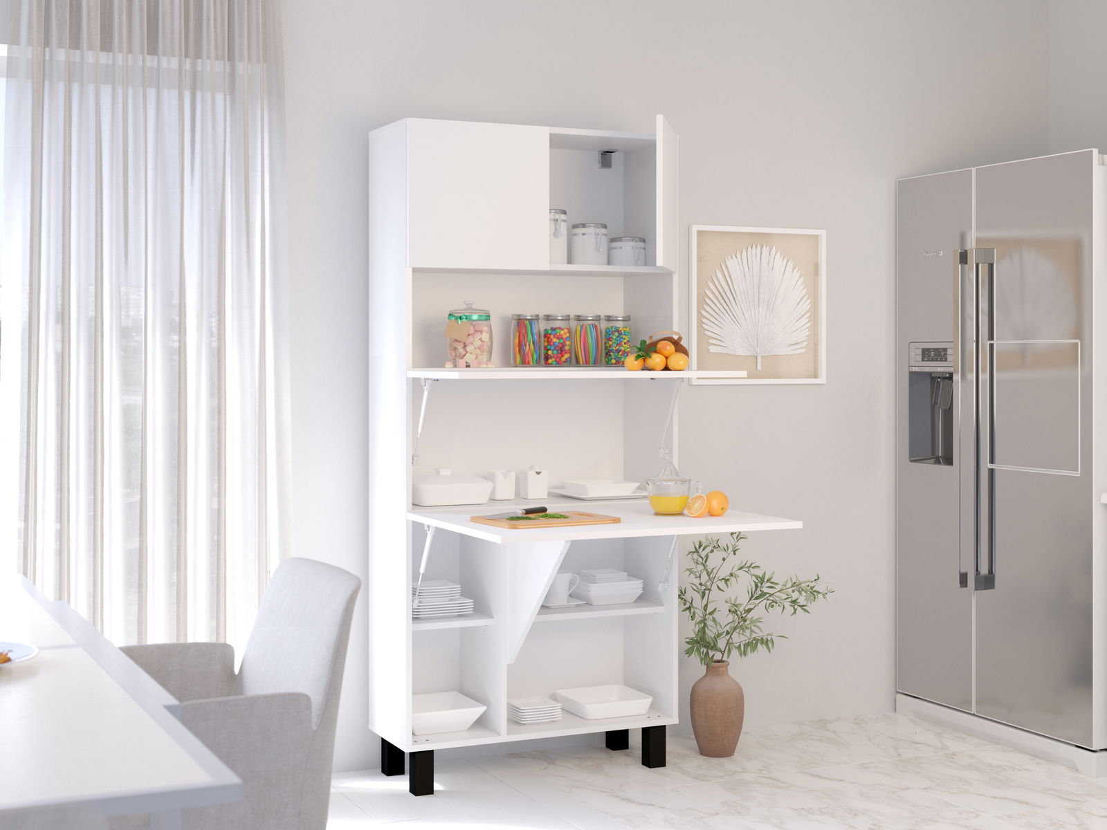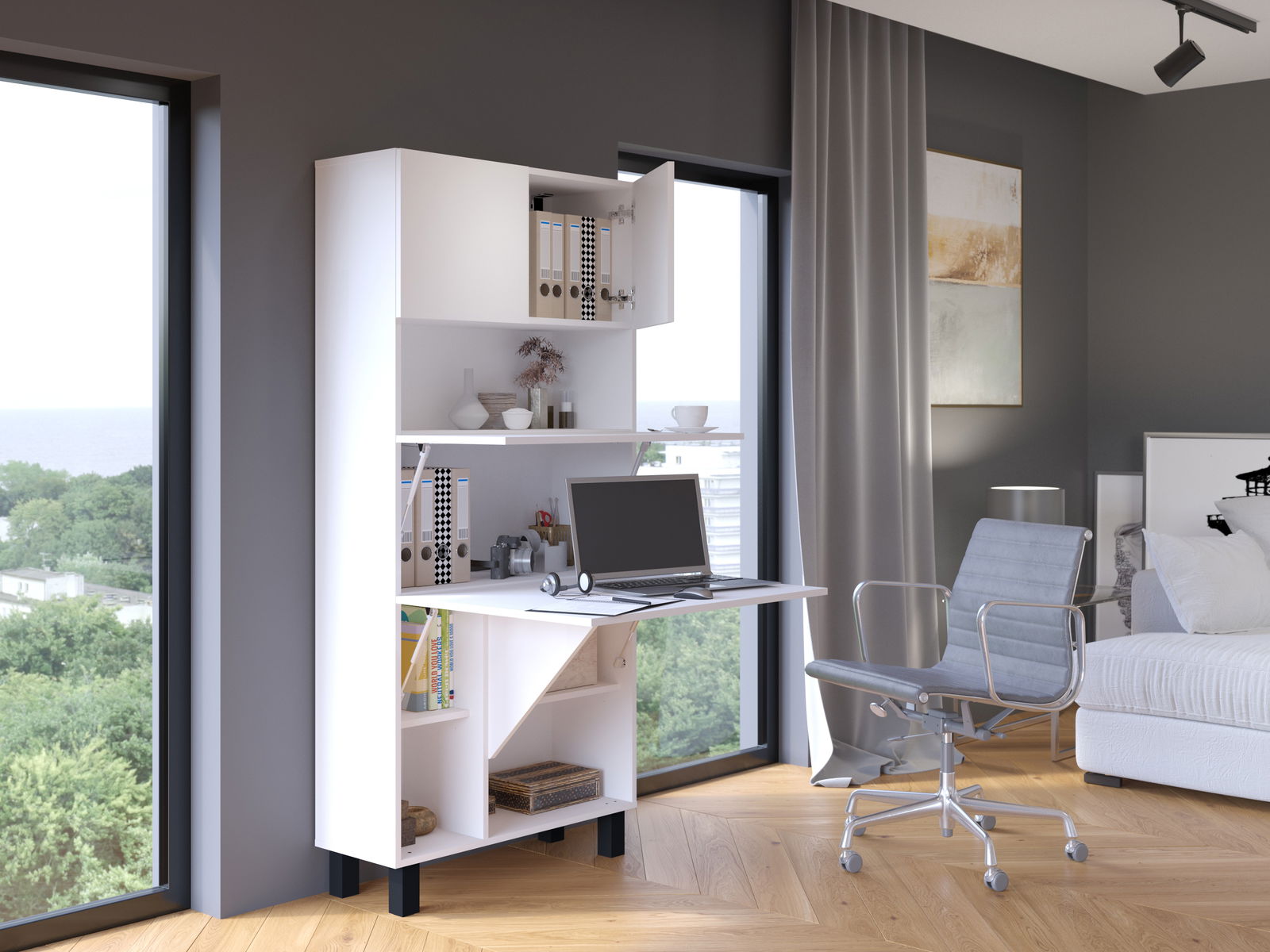 Působivý a elegantní kus nábytku kombinující klasický regál a výklopný stůl pro vytvoření multifunkčního pracovního prostoru