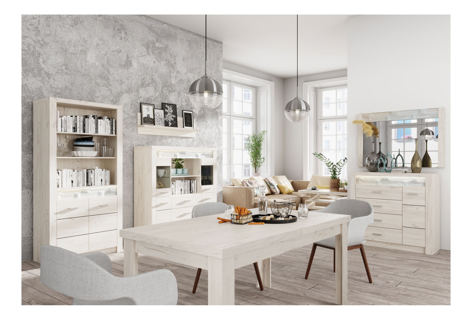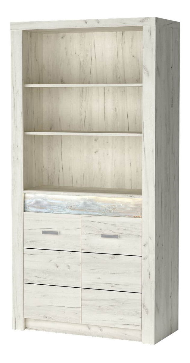 Regál na knihy, dekorace nebo dokumenty se skříňkou pod ním je velmi originální kombinace. Díky ní bude vládnout harmonie a pořádek. Na knihovně jsou dvě police, jedna ve spodní části. Dostupná LED lišta zpestří vzhled nábytku a zahřeje interiér. Kovové úchyty dotváří celý kus nábytku. S tímto kusem nábytku vytvoříte spoustu aranžmá, zapadne do každého interiéru a překvapí nejednoho hosta.