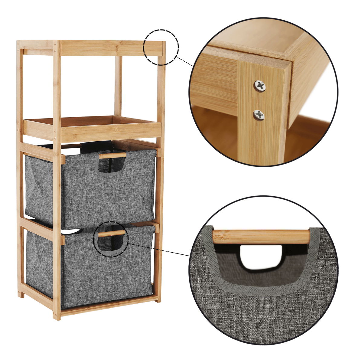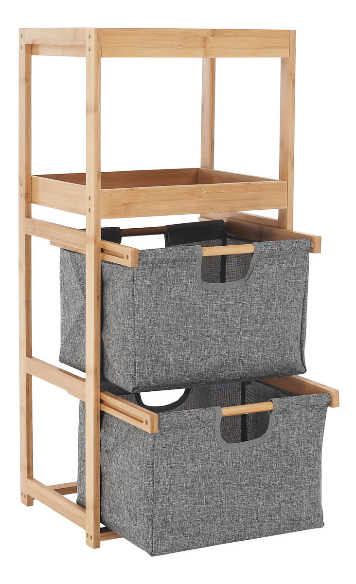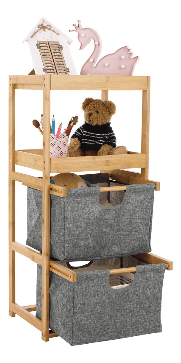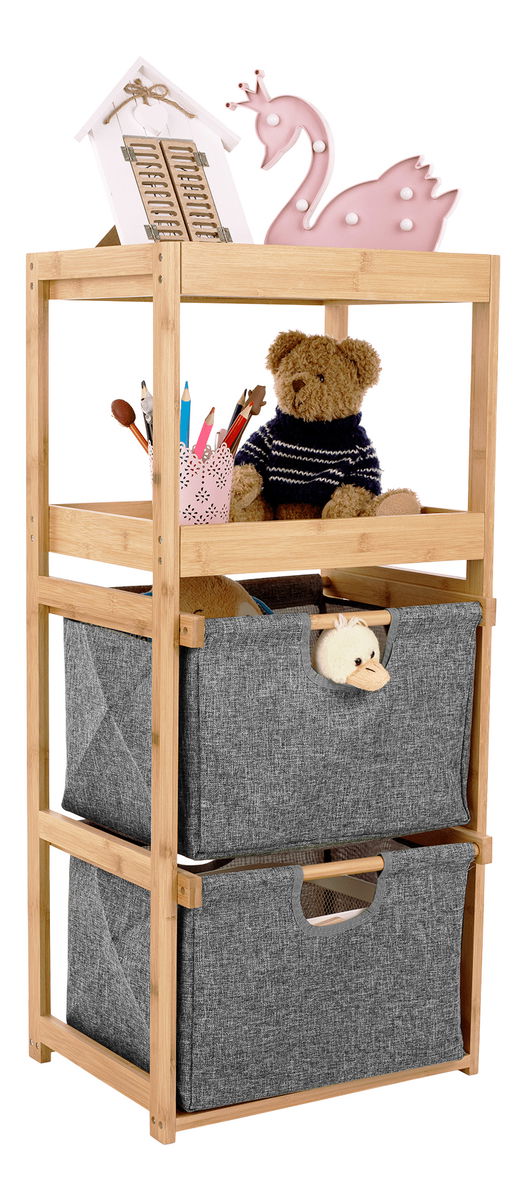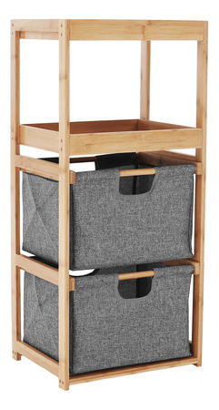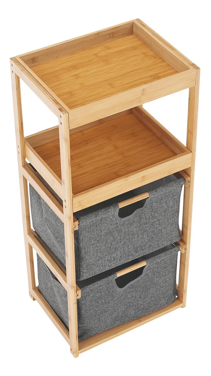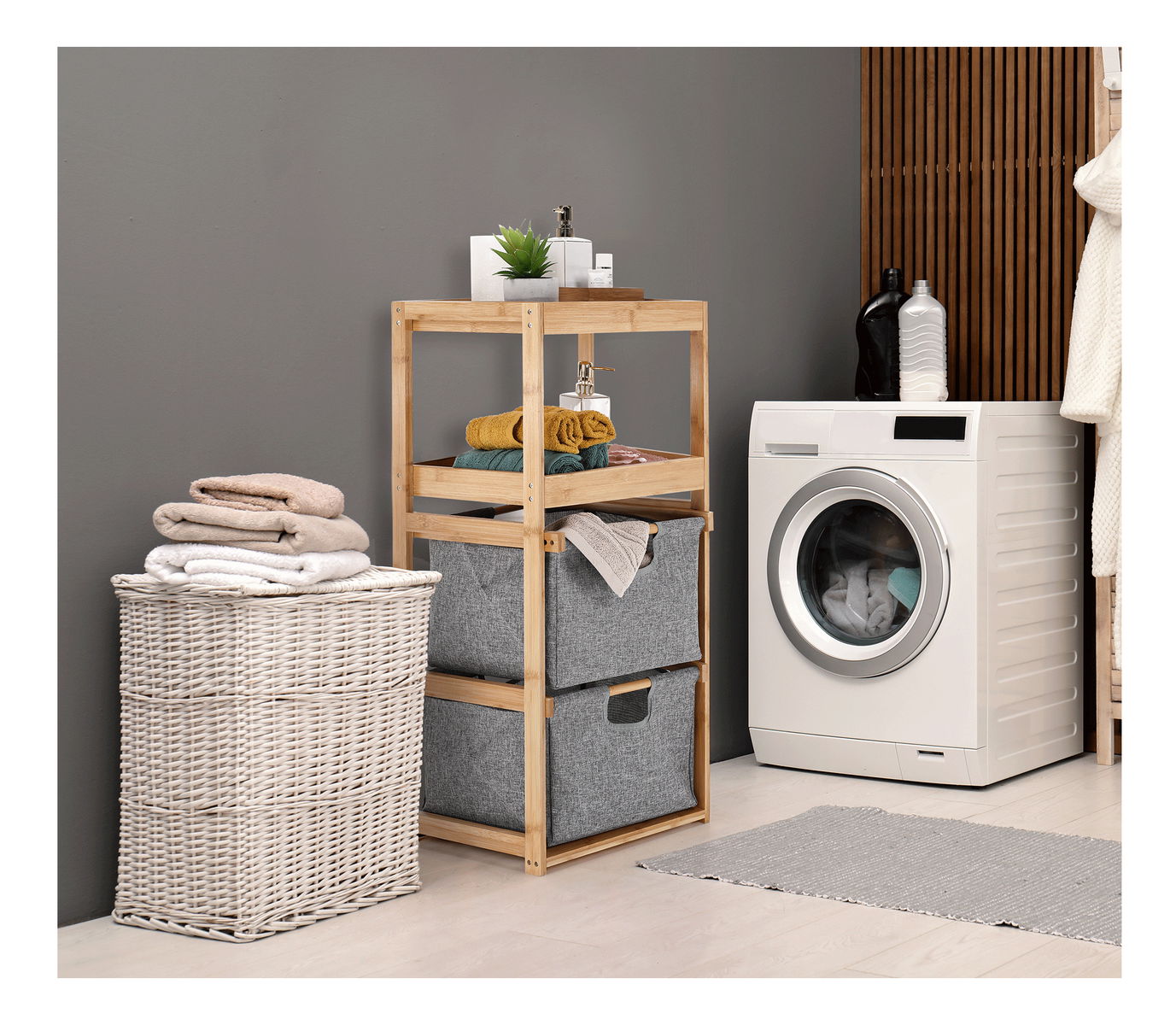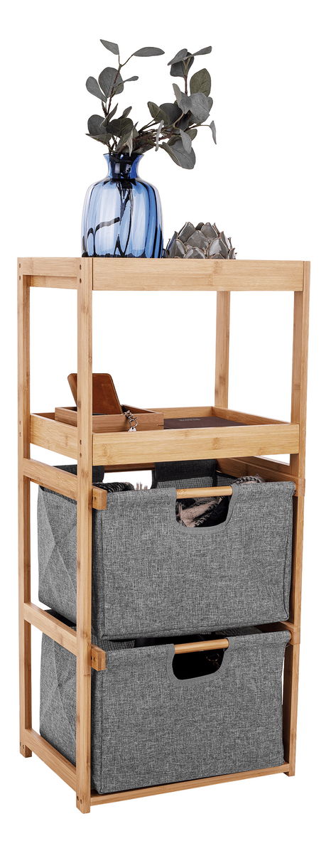 Regál Kendra (bambus + šedá) - výška 88 cm, šířka 40 cm, hloubka 30 cm. _x005F_x000D_ _x005F_x000D_ Je to velmi praktický pomocník, který může současně plnit několik funkcí. můžete použít nejen v koupelně, ale také v předsíni či v kterémkoliv pokoji, pro který se rozhodnete _x005F_x000D_ Nad zásuvkami jsou dvě poličky, na které uložíte nejen ručníky, ale i jakoukoli pěknou dekoraci _x005F_x000D_ _x005F_x000D_ Regál Kendra svým moderním designem zapadne do každého interiéru.
