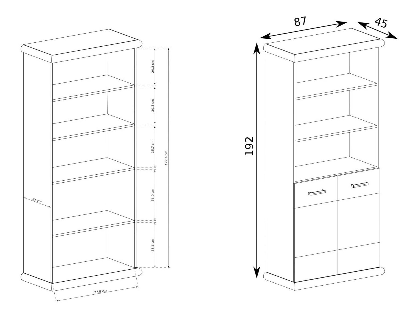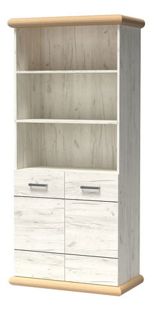 Jednoduchá velká knihovna z kolekce Kenny. Nábytek má dvě skříňky a v nich najdete tři velké police, díky kterým se dovnitř vejde množství menších i větších věcí, doplňků a dokumentů. V horní části je regál se dvěma prostornými policemi, které lze použít jak pro vystavení knih, tak pro vystavení dekorací, suvenýrů, fotografií. Konstrukce je vyrobena z odolných laminovaných desek, plastových úchytek a pantů, díky čemuž je velmi pevná.