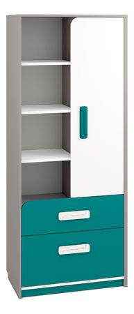 Praktický a designově zajímavý regál je řešen policemi ve vrchní části, kde pravá strana je uzavřena. V dolní části se nacházejí dvě praktické zásuvky.