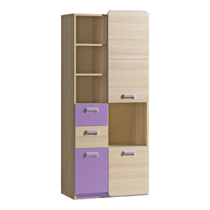 Nedostatek úložného prostoru ve studentském, či dětském pokoji vyřeší tento vyšší regál svěžího designu. Dominují mu zaoblené hrany dvířek a barevné fronty a okraje zásuvek a dvířek. Všechny knížky či hračky si najdou své místo. V levé části regálu se nacházejí tři otevřené poličky, dvě zásuvky a jedny dvířka. V pravé části se nacházejí dvoje dvířka a otevřená polička ve spodní části. Úchyty zásuvek a dvířek jsou podlouhlé.