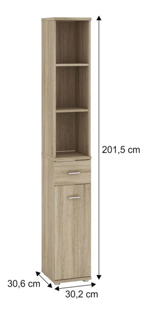 Regál Margus Typ B+C o výšce 201,5 cm a hloubce 30,6 cm je ideálním řešením pro Vaši domácnost. Tento vysoký a úzký regál má dvě otevřené poličky v horní části, jednu zásuvku uprostřed a jednu skříňku vespod, čímž Vám poskytuje dostatek úložného prostoru. Regál je vyroben z DTD laminovaného materiálu s nosností police až 5 kg. Tloušťka materiálu je 16 – 22 mm, což zaručuje jeho pevnost a odolnost. Barevné provedení je dub sonoma a dvířka mají hladká zakončení. Rozměry regálu jsou (ŠxVxH): 30,2x201,5x30,6 cm, takže se hodí i do menších prostor. Tento regál je ideální volbou pro ty, kdo hledají moderní a praktické řešení úložného prostoru.
