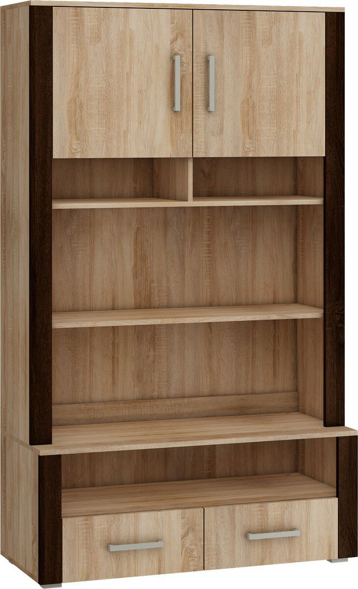 ZobrazitPraktický a stylový dvoudílný vysoký policový regál s dvěma dvířky umístěnými v horní části a dvěma zásuvkami umístěnými na spodku skříně. Mezi zásuvkami a horní skříňkou se nacházejí poličky, přesněji 4 kusy a tyto otevřený prostor regálové části dělí na 5 částí. Regál stojí na minimalistických šedých nožičkách.