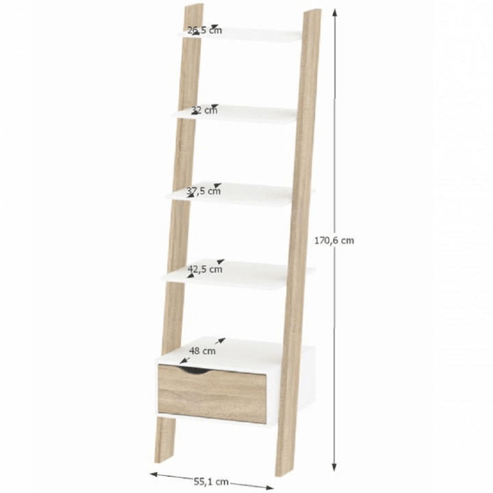 Milovníky retro designu jistě zaujme tento praktický regál. Má čtyři poličky a jednu zásuvku. Můžete si jím zařídit obývací pokoje, pracovny, studentské pokoje nebo i ložnice. Zásuvka má stylově vyřezaný úchyt. Barevné provedení zásuvky je bílá v kombinaci s dubem sonoma.