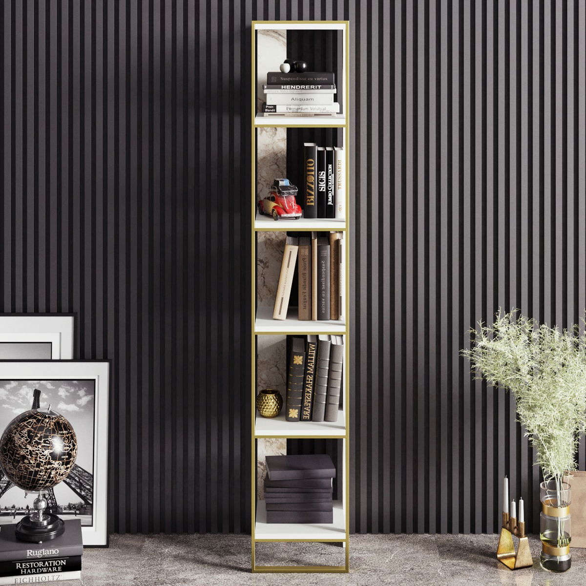 ZobrazitRegál Poppy (Zlatá + Bílá) výška 178 cm, šířka 32 cm, hloubka 31 cm. Tento regál je ideálním doplňkem pro váš domov. S jeho moderním designem v kombinaci zlaté a bílou barvou přinese do vašeho interiéru elegantní a stylový vzhled. Jeho dostatečná výška a šířka umožňuje uspořádání a uskladnění vašich věcí a příslušenství. S jeho pevnou konstrukcí a kvalitními materiály je regál odolný a dlouhodobě vydrží. Využijte jeho praktické police a vytvořte si pořádek ve svém domově s regálem Poppy.