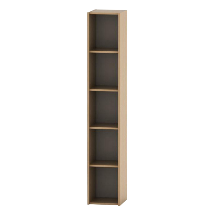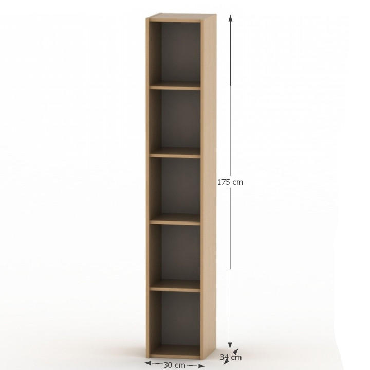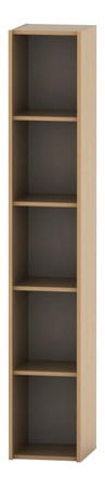 Úzký policový regál má využití pro menší kanceláře s nedostatkem prostoru. Regál disponuje pěti odkládacími prostory, které od sebe oddělují čtyři police. Barevné provedení buk.