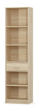 Chytrý regál jednoduchého designu, který je vhodný do dětského nebo studentského pokoje. Má pět otevřených poliček a menší zásuvku. Hodí se na knížky, dekorace nebo jiné doplňky. Barevné provedení regálu je dub sonoma.