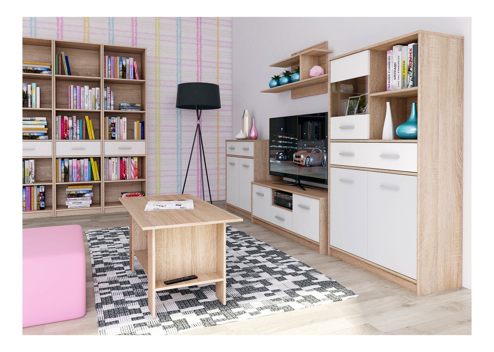 Chytrý regál jednoduchého designu, který je vhodný do dětského nebo studentského pokoje. Má pět otevřených poliček a menší zásuvku. Hodí se na knížky, dekorace nebo jiné doplňky. Barevné provedení regálu je dub sonoma.