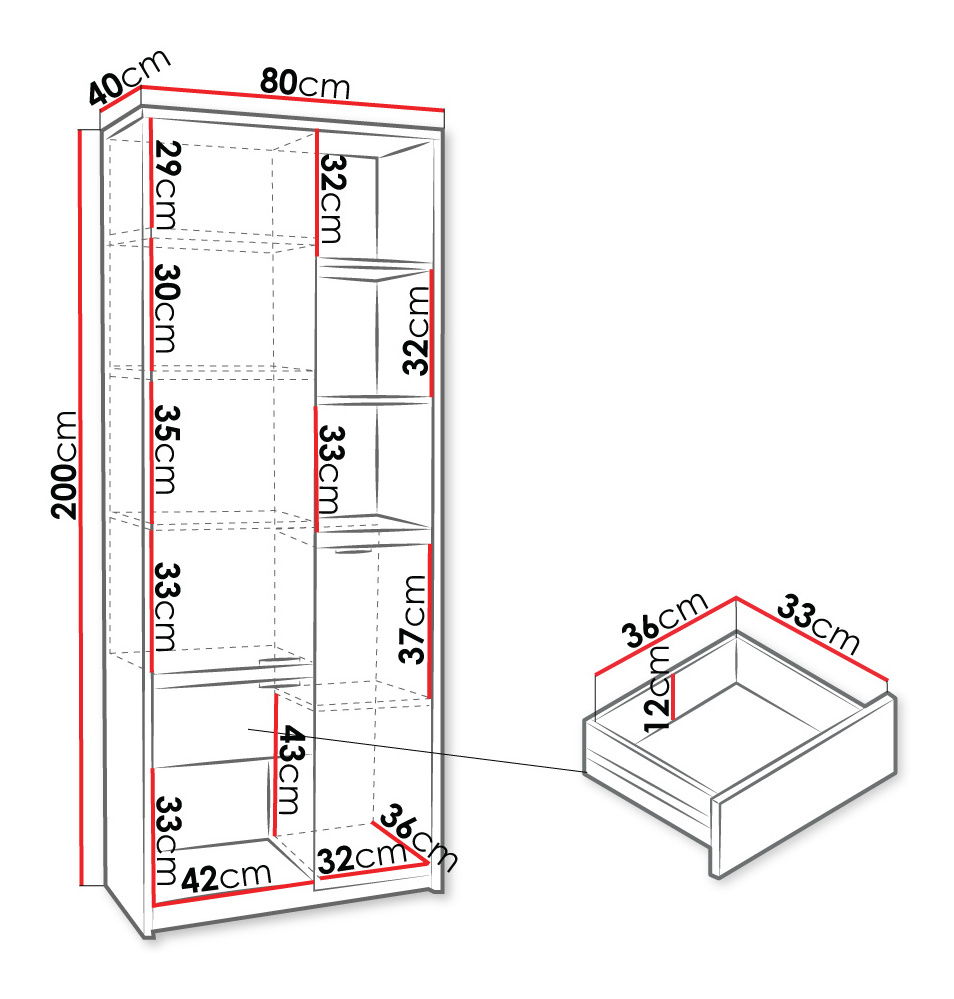 Regál je ideální volbou pro ty, kteří hledají pohodlí a styl. Rozměry: šířka: 80 cm, výška: 200 cm, hloubka: 40 cm Barvy: možnost výběru barev zde Vyrobeno: boční části a horní deska jsou z dřevotřísky 22 mm - ostatní části 16 mm, kovové úchytky