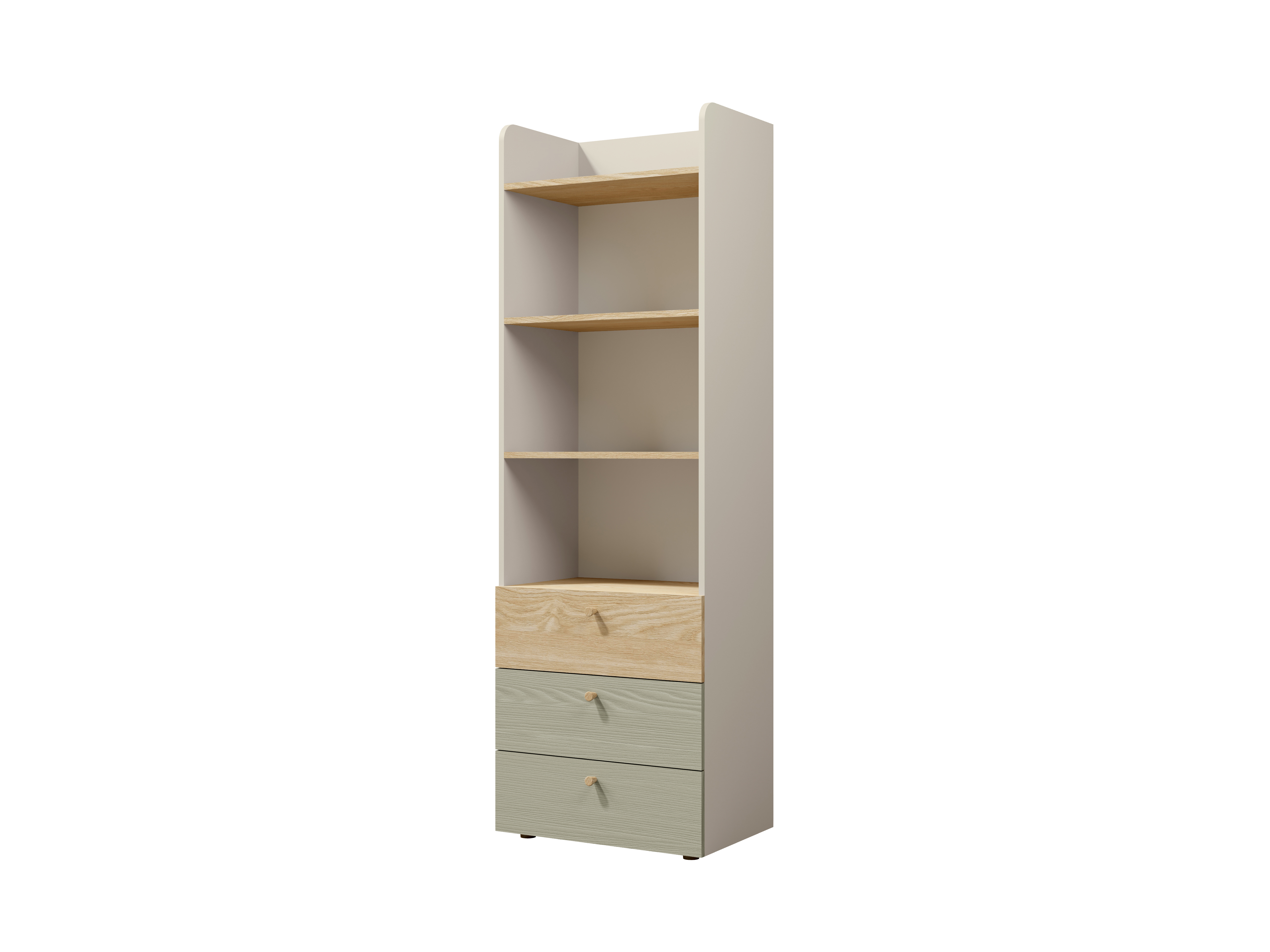 Tento regál z laminátu je skvělou volbou pro ty, kteří hledají spojení praktičnosti a moderního designu. Nabízí tři otevřené police pro snadný přístup nebo prezentaci vašich oblíbených předmětů a tři zásuvky pro skryté úložné prostory. Plastové úchyty a nohy zajišťují snadnou manipulaci a stabilitu regálu, zatímco PVC lemování zvyšuje jeho odolnost a vizuální atraktivitu. Zásuvky jsou vybaveny GTV H-35 kuličkovými vodiči pro plnovýsuv, což umožňuje snadný a tichý přístup k uloženým předmětům.