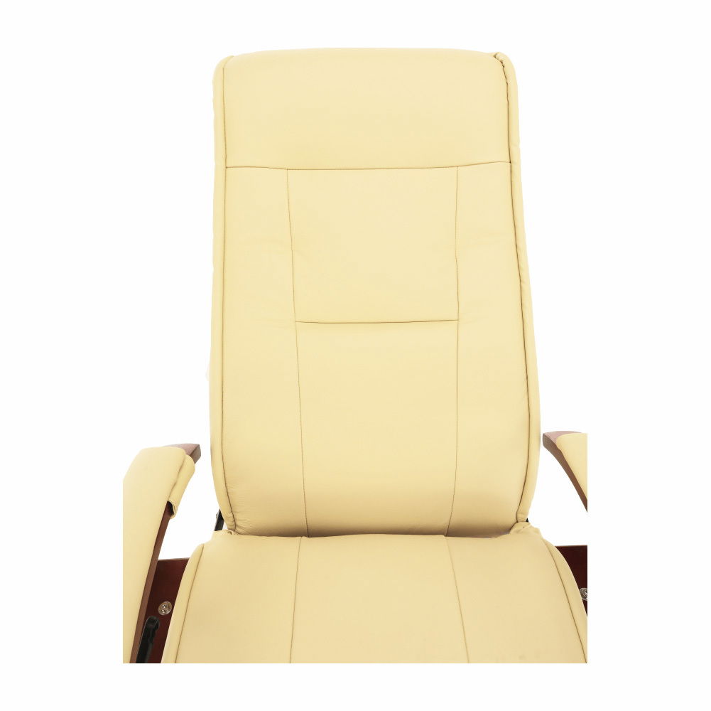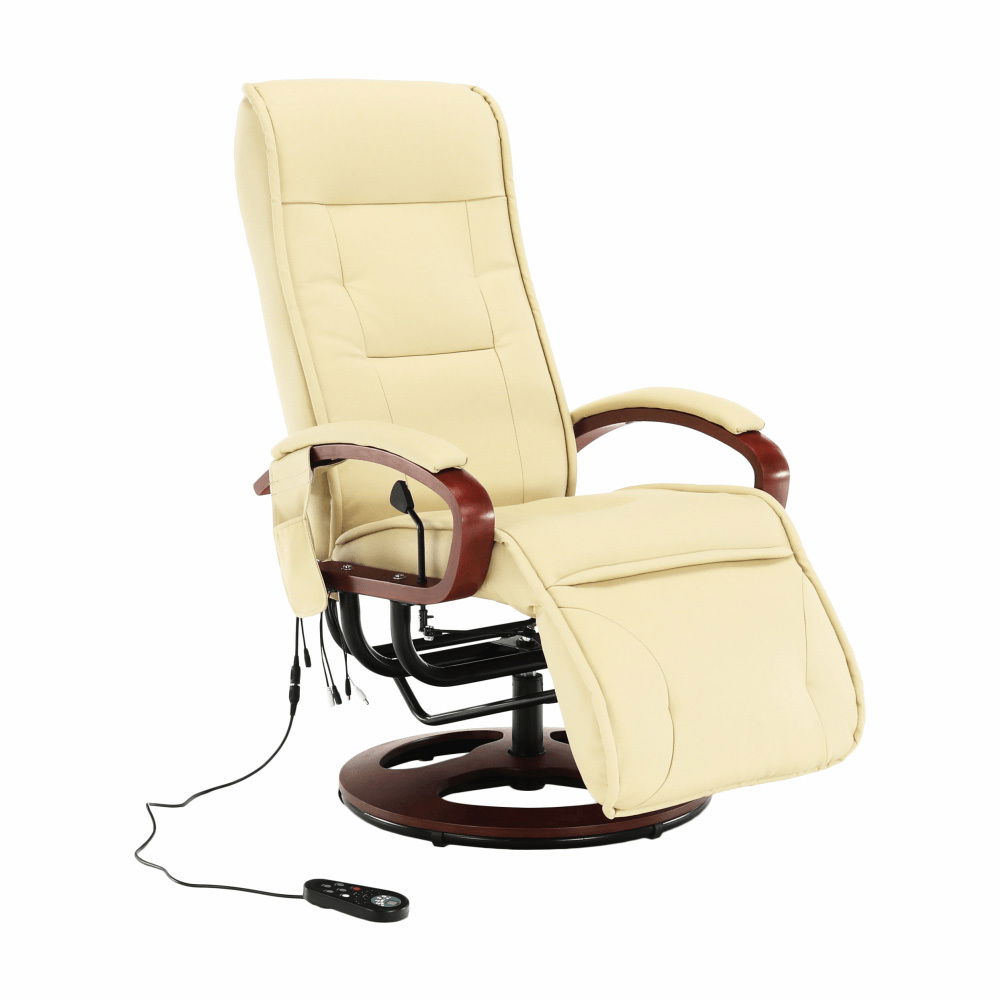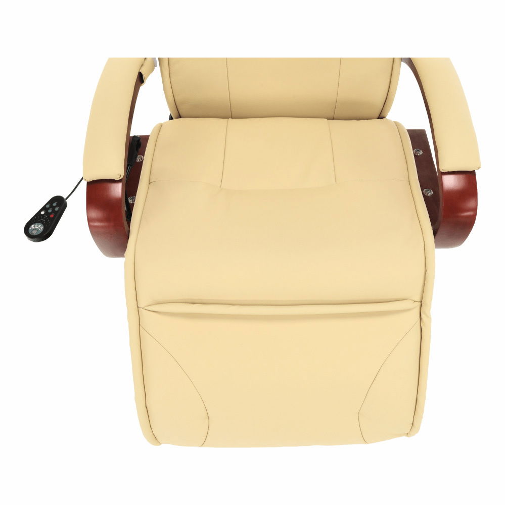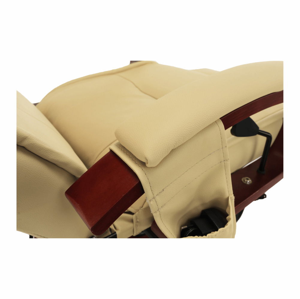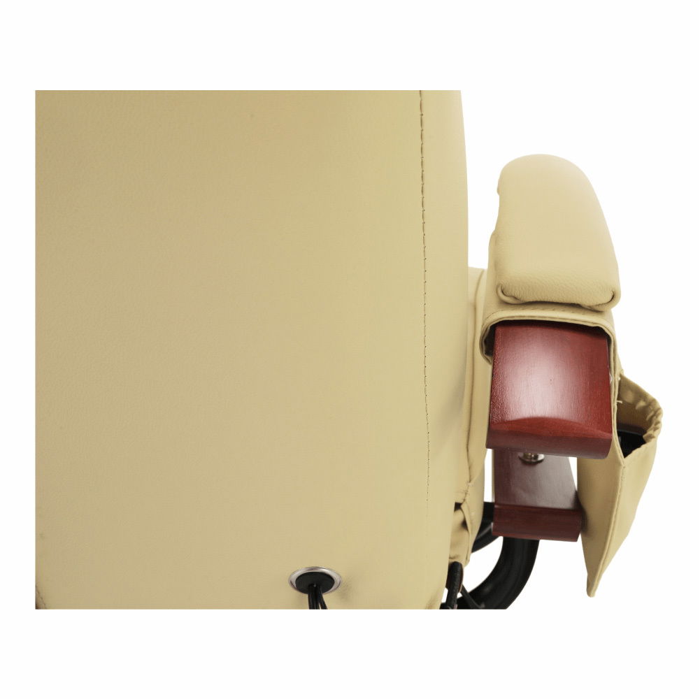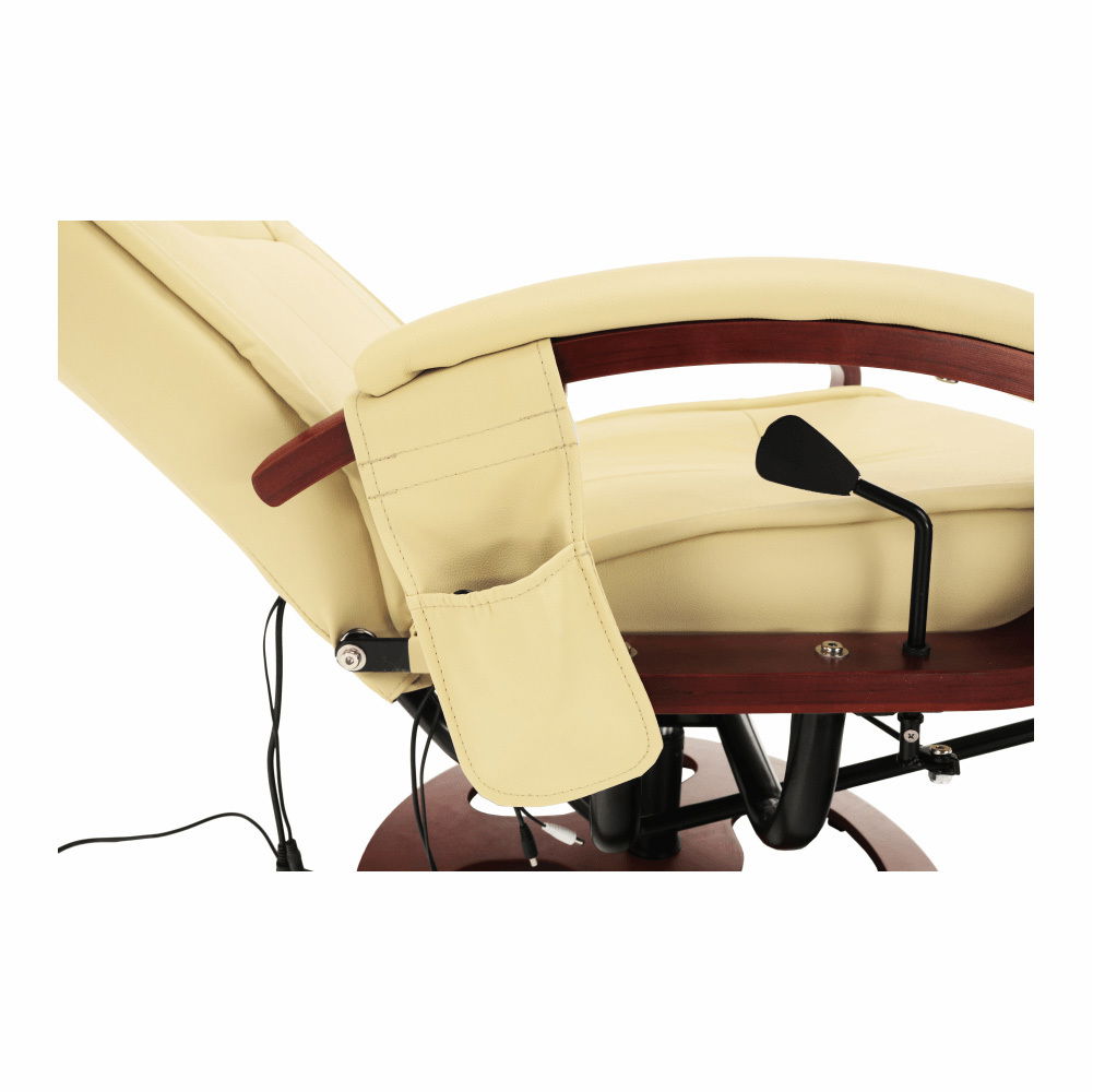 Křeslo Arturo je otočné a mechanicky polohovací. Pomocí páky si jednoduše nastavíte až tři polohy opěrky zad a podnože. Křeslo je vybaveno elektrickou funkcí masáže a vyhřívání v bederní části opěradla. Dejte se hýčkat masáží až v osmi masážních bodech. Zajímavý a efektivní tvar křesla zajišťuje dostatečnou oporu těla a podnož zase dopřeje pohodlí vašim nohám. Materiály použité při výrobě – ekokůže a pravá hovězí kůže – jsou pevné a odolné a ve vzájemné kombinaci působí velmi stylově. Křeslo nabízíme v barevném provedení elegantní béžové, dřevo má odstín třešně.