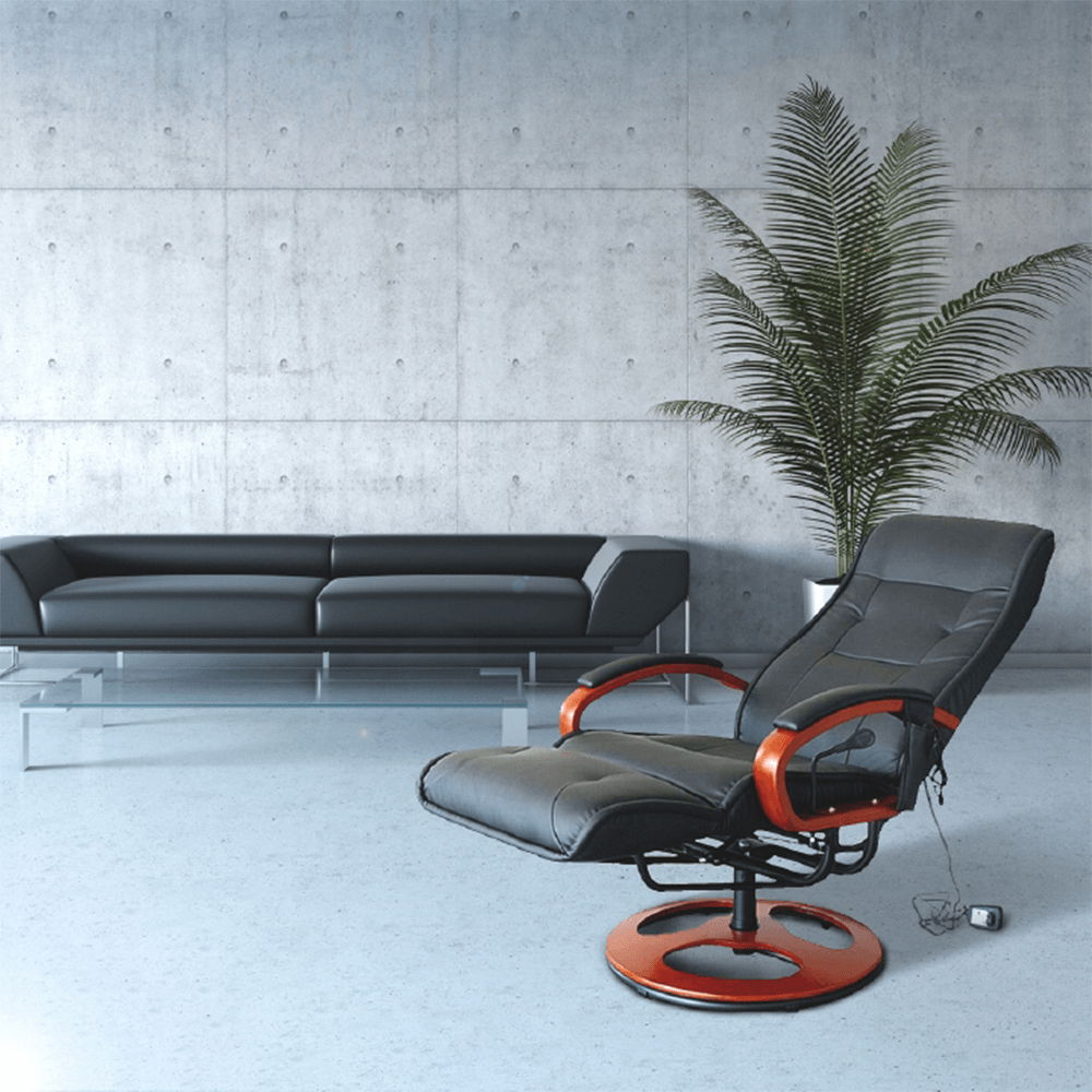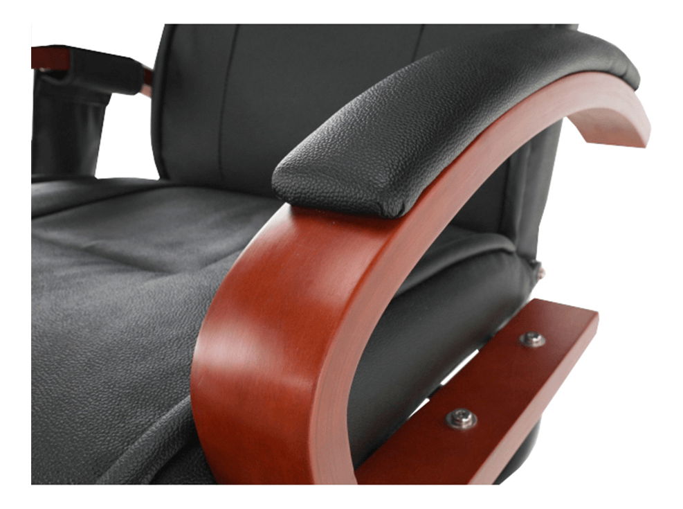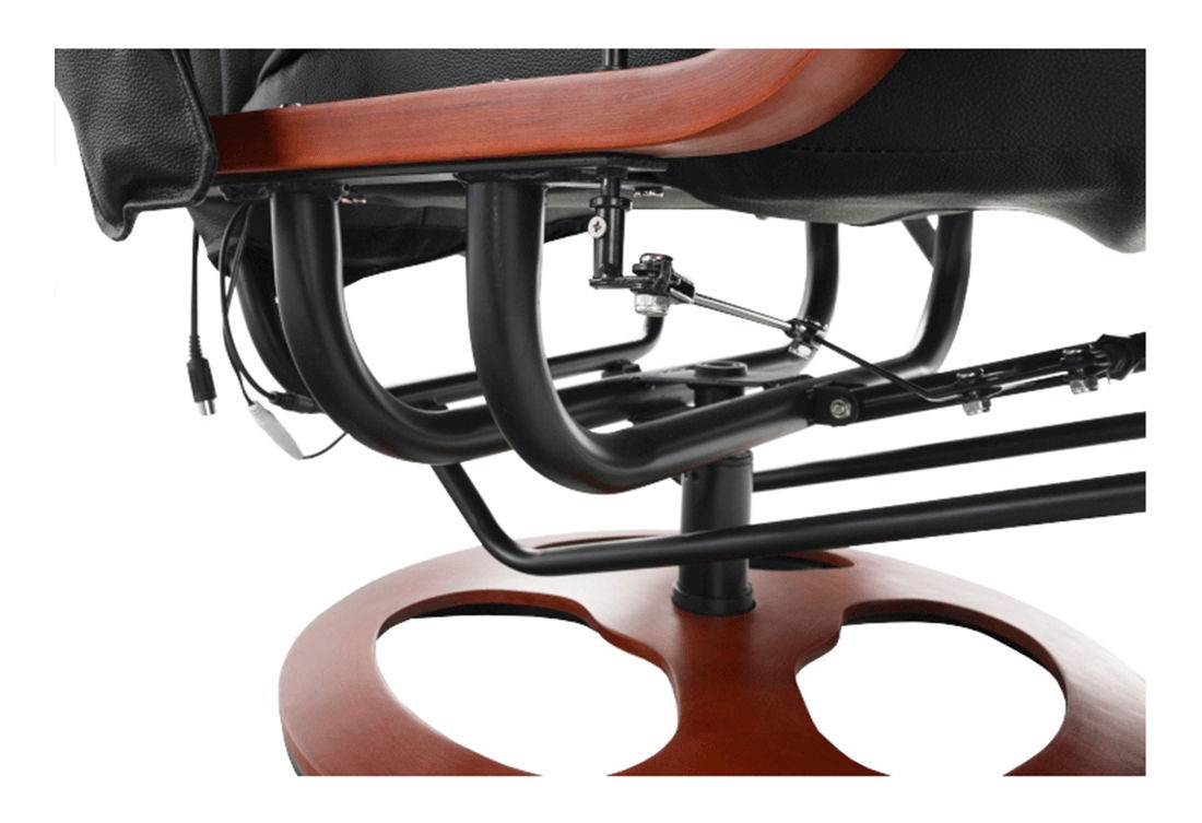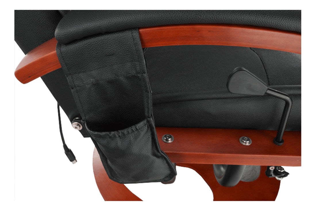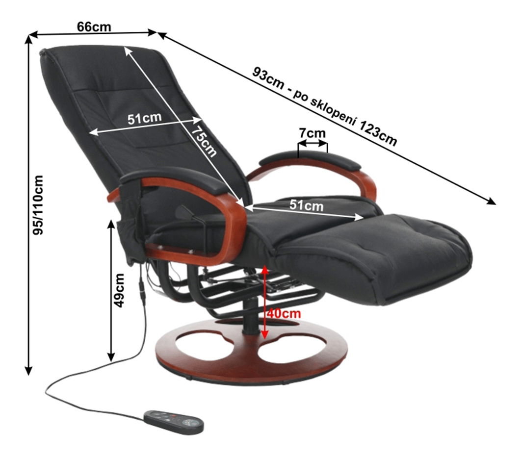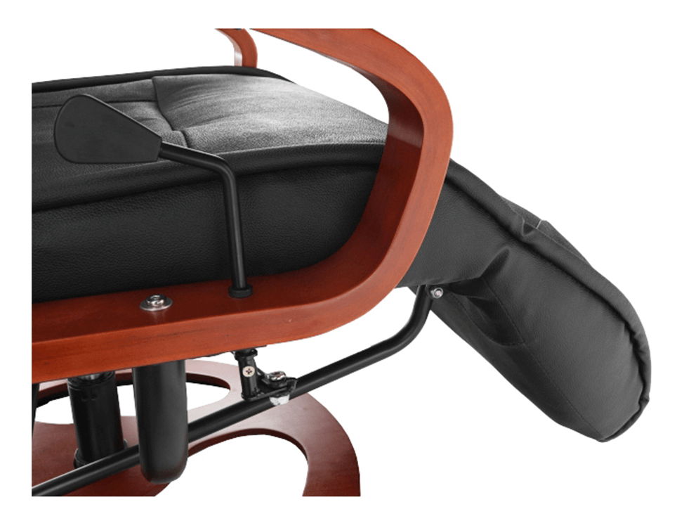 Relaxační křeslo Artuš 2 má polohovatelné opěradlo a elektricky řízených 8 masážních bodů. Je čalouněné hovězí kůží v kombinaci s ekokůží. Dřevěné části jsou v barvě třešeň.
