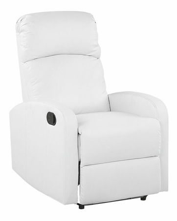 Odpočiňte si po náročném dni a načerpejte síly odpočinkem na tomto čalouněném a hrubě vyztuženém křesle s podnožkou. Je vyrobeno z kvalitní umělé kůže v bílé barvě, vydrží dlouhodobé používání a nevyžaduje téměř žádnou údržbu. Křeslo lze zcela sklopit do polohy ležmo jen pomocí váhy těla, díky čemuž si budete moci při sledování televize zdřímnout. Kromě toho je vybaveno i USB portem, který lze využít k nabíjení telefonu nebo jiných elektronických zařízení.