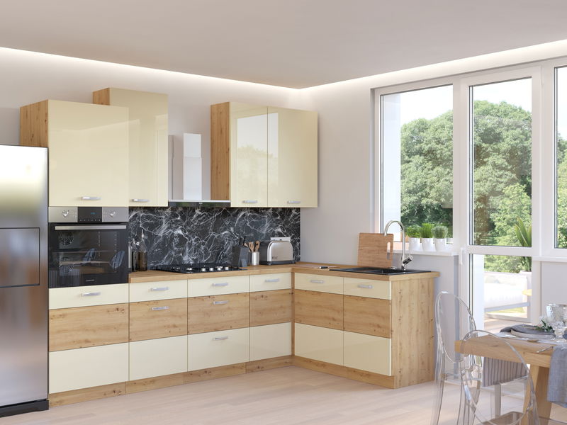 Rohová dolní kuchyňská skříňka Arryn 90 x 90 DN 2F BB (dub artisan + lesk cappucino)