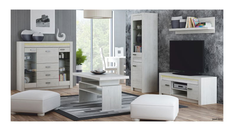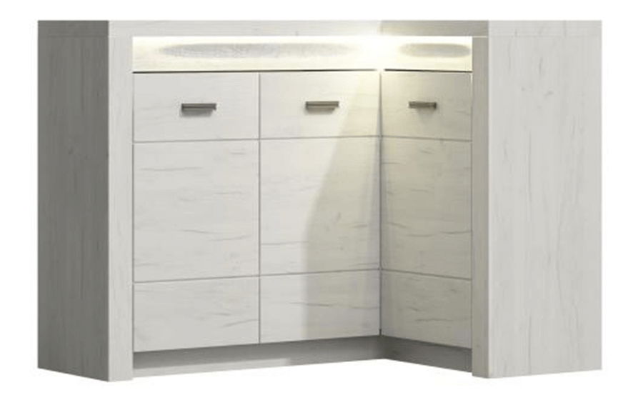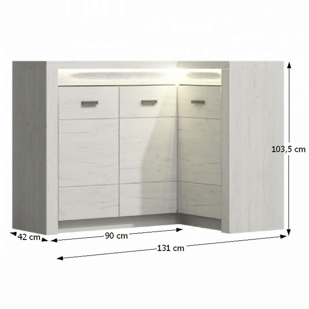 Rohová komoda 15 z luxusního sektorového nábytku vysoké kvality v masivním designu s prvky surového malovaného dřeva a výraznou reliéfním kresbou, s efektývnym LED podsvícením, vhodná na zařízení obývacích pokojů a jídelně, korpus hrubý až 48 mm, úchyty kovové, materiál DTD laminovaná, ABS hrany,