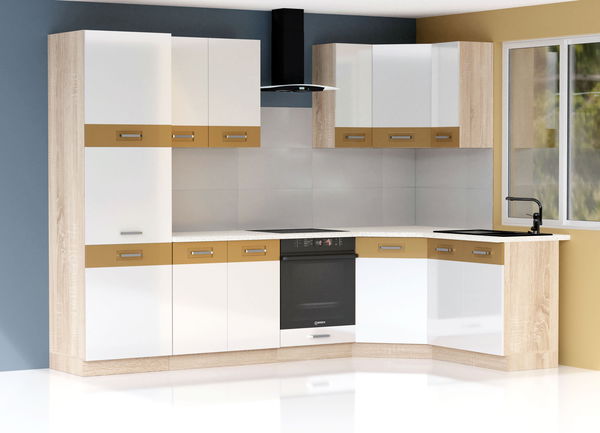 Rohová kuchyně 290 + 170 cm Kallema (samoa + cappuccino + lesk bílý)