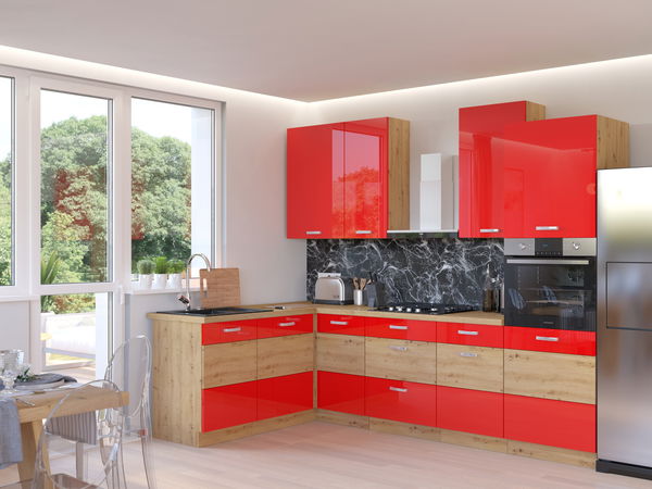 Rohová kuchyně Arryn 275 + 170 cm (dub artisan + červená)