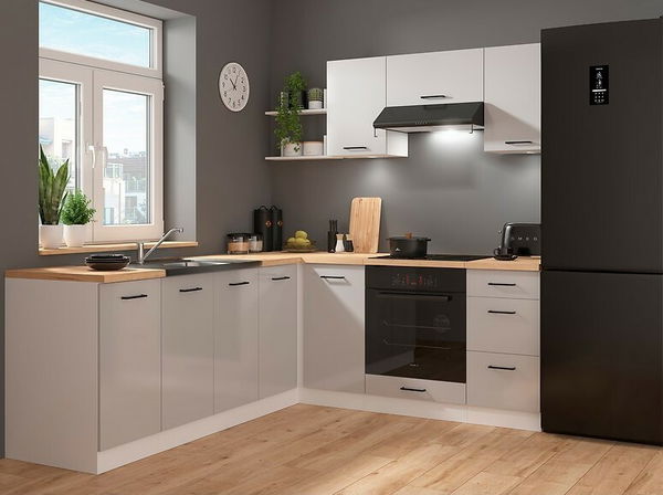 Rohová kuchyně BRW Junona Line 200 + 220 cm (bílá + lesk světle šedý)