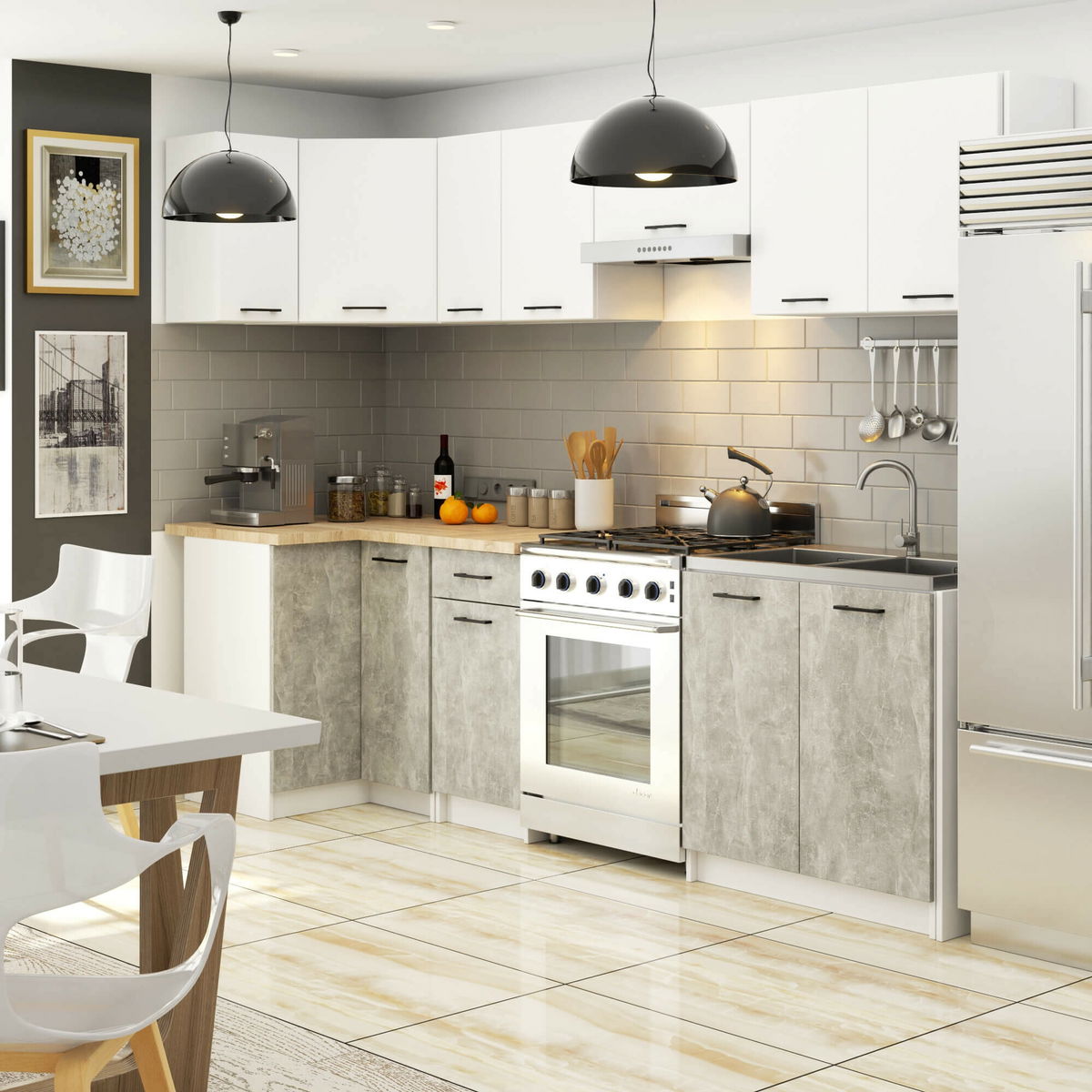 Rohová kuchyňská sestava 300 cm Ozara III (bílá + beton)