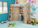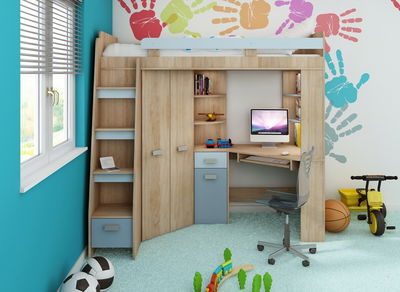 Fantastický a promyšlený kus nábytku, který Vaše dítě bude milovat. Dětské pokoje s malou plochou bývají často přeplněné nábytkem a dítě se nakonec nemá kde hrát. Antresola chce řešit tento problém s nedostatkem prostoru a nabízí 3 typy nábytky v jednom kompaktním provedení. Základ tvoří obrovský rohový šatník (4 rozměrné police a jedna věšáková tyč), kde umístíte všechny potřebné věci. K rohovému šatníku je připojen rohový pc stolek s deskou na klávesnici, skříňkou a zásuvkou na levé straně a 4 rohovými úložnými policemi na nosných sloupech postele. Nad rohovým stolkem je upevněna jednolůžková postel se zábranou proti vypadnutí. Do postele není potřebné dokoupit rošt. Namísto roštu má postel desku, na kterou se položí matrace. Doporučujeme dokoupit matraci s rozměrem matrace 200 cm hloubka a 80 cm šířka, doporučená výška matrace (tloušťka) by měla být 10 cm, jinak ztratí bariéra proti vypadnutí svůj smysl. K posteli se vystupuje po poměrně vysokých čtyřech schodech (hrubé 1,6 cm) z nichž spodní schod má pod sebou úložný prostor. Tyto schody jsou připevněny k šatníku z opačné strany - oproti PC stolku. Skříň je vybavena masivními úchyty na dvířkách a zásuvkách. Levé provedení - rohový šatník a schůdky k posteli jsou na straně levé. Nosnost 80 kg.