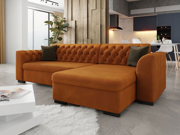 Rohová rozkládací pohovka Leon je elegantní nabídka! Charakter podtrhuje hluboké prošívání, které bylo použito na zádové opěrce a vnitřní části područek. Dekorativní akcent navíc dokonale ladí s použitou látkou. Navíc sada obsahuje dva malé polštářky se zipem. Na druhou stranu použité komponenty odpovídají za komfort používání. Díky silné vrstvě pěny je sedák extrémně měkký a pohodlný. Rohová sedací souprava nabízí funkci spaní. V rozloženém stavu má povrch 225 cm x 125 cm, což zajišťuje pohodlný spánek pro dvě osoby. Náhradní lůžkoviny si však můžete nechat v úložném prostoru, který je umístěn pod sedadlem.