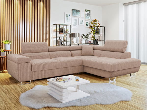 Rohová rozkládací pohovka Torezio je ideální volbou pro ty, kteří hledají pohodlí a styl. Moderní vzhled rohové rozkládací pohovky Torezio zvýrazní skvělý styl zařízení vašeho obývacího pokoje. Barvy čalounění rohové sedačky dokonale ladí s jakoukoli dekorací stěny a vzorem podlahy. Módní odstíny čalounění v kombinaci s chromovými nohami navíc zdůrazňují charakter interiéru a ostatních kusů nábytku. Pohovka ve tvaru písmene L výborně pasuje ke kulatému konferenčnímu stolku, jakož ik obdélníkovému konferenčnímu stolku. Toto harmonické duo je ideální do pokoje pro hosty. Poskytuje spoustu prostoru k sezení a vytváří ideální podmínky pro setkání s přáteli. Promyšlený design a doplňky jsou zodpovědné za zvýšenou kvalitu odpočinku. Polohovatelné opěrky hlavy patří budou oblíbené u celé rodiny. Lze je přizpůsobit tvaru těla dítěte, ale i dospělého. Výhodou nábytku je také rozkládací funkce. V rozloženém stavu poskytuje komfortní podmínky pro každodenní spánek. Prostorný úložný prostor na ložní prádlo řeší starosti s ukládáním polštářů a peřin. Pomůže vám s udržováním pořádku v obýváku a poskytuje i další prostor pro sezónní oblečení a jiné vzácně používané věci. Rozměry : délka: 274 cm, šířka: 203 cm, výška: 70-87 cm, plocha na spaní: 198 x 125 cm, rozměry úložného prostoru: délka: 173 cm, šířka: 92 cm, výška: 17 cm 2544 pěna tloušťka 10 cm, konstrukce opěradla: dřevěný rám + vlnitá pružina + filc + vata + T 2544 pěna, tloušťka 8 cm, rozkládací funkce, úložný prostor, nastavitelné opěrky hlavy, 9 cm vysoké nohy, přední část dačka (zadní strana potažená látkou) Možnost zakoupení pasujících produktů : Konferenční stolek Komoso Regál Runoya I Záruka : 24 měsíců