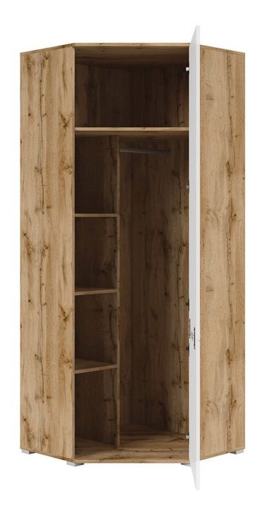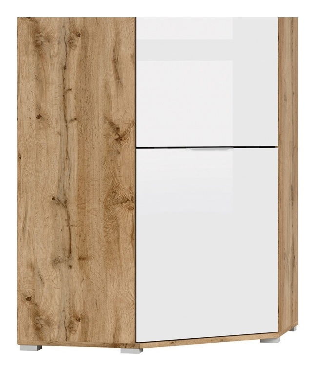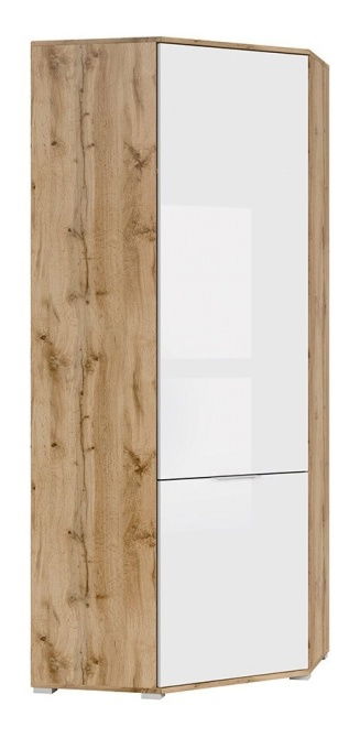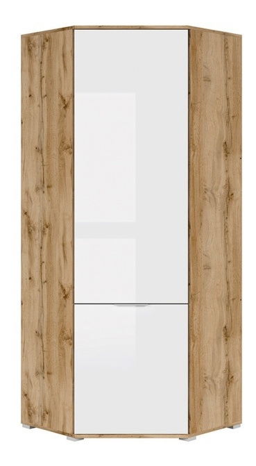 ZobrazitProstorná rohová skříň z kolekce ZELE vám ve vaší ložnici ušetří kopec místa. Obsahuje 1 závěsnou tyč na šaty a košile a 1 horní polici po celé šířce. V její pravé části se nacházejí 3 malé police pro uložení triček, spodního prádla a pod. Police unesou hmostnost od 4 do 5 kilogramů. Skříň se prodává v barvě světlého dubu wotan a středová dvířka jsou bílá lesklá.