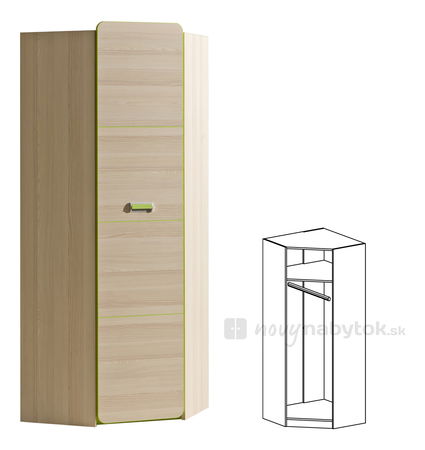 Rohová šatní skříň nabízí dostatek prostoru pro zavěšení oblečení Vašeho dítěte. V horní části je polička, pod kterou je umístěna věšáková tyč.