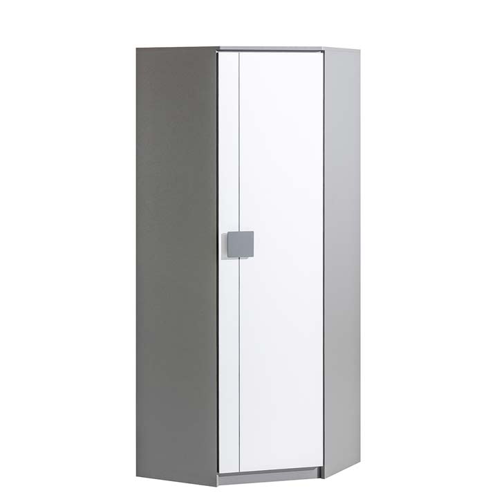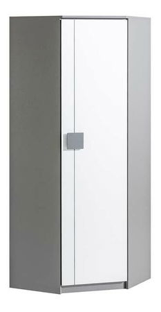 Oblečení, boty, či jiné doplňky si najdou své místo v této prostorné rohové šatní skříni. Skříň má přitažlivý moderní design, který je doplněn o tenké barevné linie. Dveře skříně mají výrazný čtvercový úchyt. Skříň je výborným a užitečným doplňkem zejména do dětských a studentských pokojů.