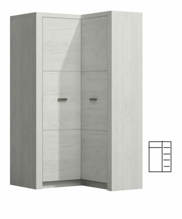 Kvalitní rohová skříň Infinity vhodná do zařízení obývacích pokojů, ložnic, nebo jídelen. Na levé straně se nachází věšáková tyč a jedna horní polička. V pravé části najdete za dveřmi čtyři police. Barevné provedení jasan bílý. Skříň je dodávána v demontu.