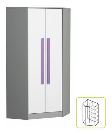 Praktická rohová skříň Piere vhodná na zařízení studentských a dětských pokojů. Uvnitř skříně je kombinovaná věšáková část s policovou částí. Dodávána je v pěkné barevné kombinaci šedé a bílé. Úchyty dveří jsou fialové.