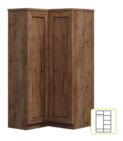 Rohová věšáková skříň Tedy poskytne dostatek úložného prostoru pro vaše oblečení. Je masivnějšího vzhledu a v barevném provedení dub lefkas. Ocení ji zejména milovníci nábytku rustikálního stylu.