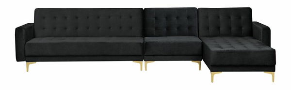 Tato velká rohová pohovka je ideálním kusem nábytku do vašeho obývacího pokoje. Sestává z třímístné a jednomístné pohovky a lehátka. Díky nastavitelnému opěradlu ji lze snadno rozložit na pohodlnou postel pro dvě osoby. Lehátko může být umístěno na pravé nebo levé straně. Tato pohovka je celá čalouněná vysoce kvalitní a stylovou černou sametovou látkou s elegantním prošíváním a nabízí funkčnost i nadčasový styl. Je dobrou volbou do moderních, ale také tradičně zařízených interiérů. Stabilitu pohovky zaručují kovové nohy.