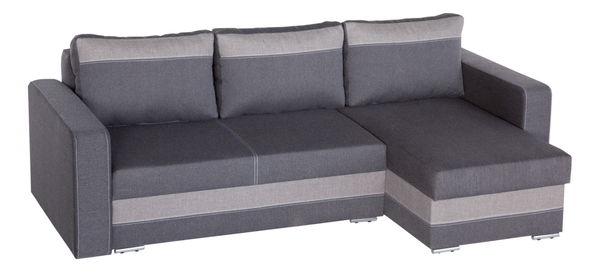 Moderní rohová sedací souprava ve dvou barevných odstínech šenilu Inari s kontrastním šitím na sezení. Pružinové sezení zajišťuje pohodlí při sezení. Rozložením vznikne plocha na přespání. Má praktické dva úložné prostory. Sedačka je postavena na kovových nohách.