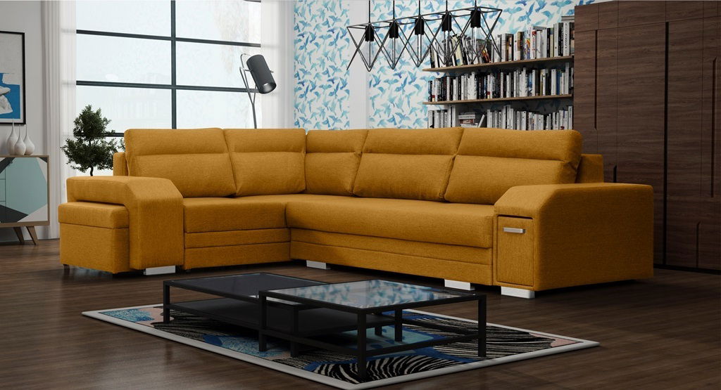 ZobrazitRohová sedačka Alfredo v hořčičné barvě o rozměrech 90 cm x 205 cm má v jedné opěrce ukrytý minibar a ve druhé otoman, je rozkládací se dvěma úložnými prostory. Čalouněná tkaninou Malmo 41, která je odolná vůči žmolkování a slunečnímu záření a testována na oděruvzdornost s 50 000 oděry. Konstrukce z dřevotřísky a lamino desky, pružiny faliste, výplň z pěny T-30 a nožičky z plastu v chromové barvě. Rozkládací mechanismus je automat a sedačka má hloubku sedu 56 cm a výšku sedu 42 cm. Sedačka má také plochu na spaní 250 x 150 cm a je dodávána ve dvou balících.
