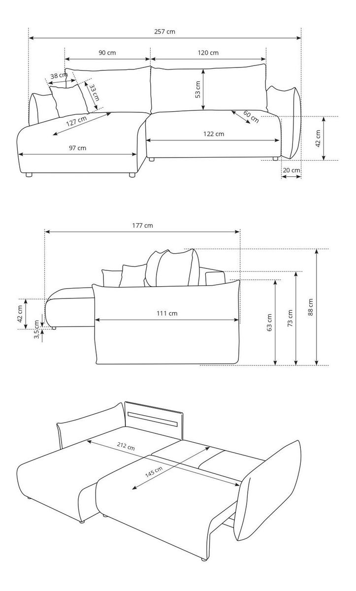 ZobrazitTato rohová sedačka spojuje eleganci s praktičností a pohodlím. Její konstrukce je vyrobena z borovicového dřeva a dřevotřísky, což zaručuje pevnost a dlouhou životnost. Sedák je vyplněn PUR pěnou T-1620, která poskytuje optimální podporu a pohodlí. Sedačka je rozkládací, s plochou na spaní o rozměrech 145 x 212 cm, ideální pro hosty. Výška sezení je 42 cm a hloubka sezení 60 cm, což přispívá k pohodlnému sezení. Zádovou opěrku tvoří polštáře, včetně jednoho dekorativního polštáře v ceně. Sedačka má úložný prostor o rozměrech 118,6 x 67 x 18,5 cm, ideální pro uschování různých předmětů. Hřbet sedačky je potažen stejnou látkou, což dodává jednotný vzhled. Sedačka nemá nastavitelné opěrky hlavy ani područky. Nožičky jsou černé plastové, výšky 3,5 cm, a zajišťují stabilitu a moderní vzhled. Typ rozkládání je DL, což usnadňuje manipulaci při rozkládání sedačky.
