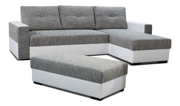 Rohová sedačka s moderním designem se bude skvěle vyjímat ve Vašem obývacím pokoji. Kombinace ekokůže a látky je příjemná na sezení a elegantní na pohled. Tmavé plastové nohy dotvářejí celkový design sedačky. Pohodlné sezení zaručují pružinové matrace. Sedačka je nerozkládací, spací plocha vznikne přisunutím taburetky, která je v ceně sedačky. Na výběr máte z několika barevných provedení.