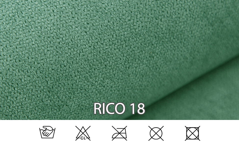 Pletená potahová látka vyrobena z polyesteru (PES). Je charakterizována silnou strukturou a odolností vůči žmolkům. Potahová látka Rico je odolná proti roztahování, roztržení a také slunečnímu záření. Pokud si vyberete sedačku v této látce můžete si být jisti, že zůstane po dlouhá léta ve svém stálém tvaru a nebude se měnit její forma po dlouhou dobu. Látku lze čistit na mokro tj. prát.