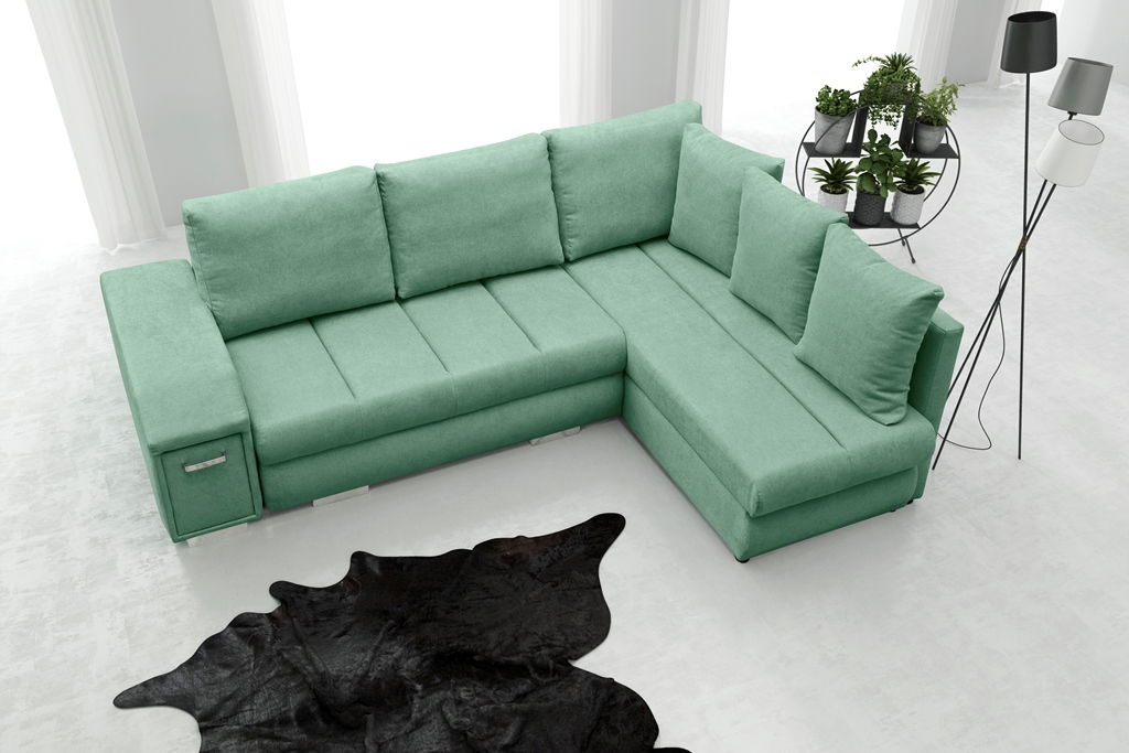 Rohová sedačka Arlene (zelená) (P) o výšce 90 cm a hloubce 189 cm je ideální pro každodenní spaní a nabízí praktický minibar ukrytý v opěrce. silnou strukturou a odolností vůči žmolkům. roztahování, roztržení a slunečnímu záření, takže si můžete být jisti, že sedačka si zachová svůj tvar po dlouhé roky. Látku je možné prát na mokro. .Sedačka má rozměr plochy na spaní 147 x 200 cm a 2x úložný prostor. Hloubka sedu je 53 cm a výška sedu je 42 cm.