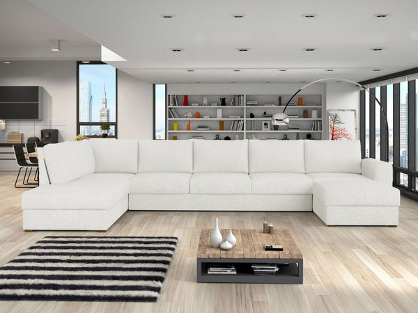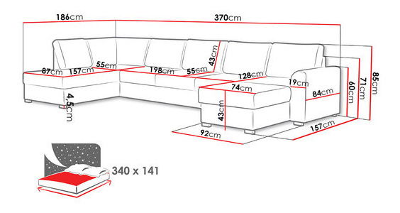 Rohová sedačka je ideální volbou pro ty, kdo hledají pohodlí a styl. Hledáte velkou a pohodlnou sedačku, která bude ozdobou vašeho obývacího pokoje? Pokud ANO, pak máme pro vás ideální model - rohovou sedačku Astana Large Premium! Prezentovaná sedačka má design ve tvaru písmene „U“ a nabízí spoustu místa k sezení. Na sedačce si můžete odpočinout i vleže, protože má dvě ležící plochy. Pocit komfortu dodávají použité komponenty. Sedák je vyroben z hrubé pěny T2844 a vlnitých pružin a opěradlo je tvořeno 7 pohyblivými polštáři, které zároveň slouží jako dekorační prvek. Je také třeba dodat, že sedačka má rozkládací funkci. Po rozložení je její plocha na spaní 141 cm, což zajišťuje pohodlný spánek pro dvě osoby. Náhradní ložní prádlo můžete uložit do dvou úložných prostor umístěných pod sedačkou. Rohová rozkládací sedačka Astana Large Premium je jedinečný model, neboť na její výrobu byly použity ty nejkvalitnější materiály. Sledují aktuální trendy interiérového designu a jsou příjemné na dotek. Rozměry: délka: 370 cm, šířka: 186 cm, výška: 85 cm, plocha na spaní: 340 x 141 cm Rozměry úložného prostoru (dva kusy): délka: 180 cm, šířka: 80 cm, výška: 21 cm, a délka: 150 cm, šířka: 6 dřevěný rám + pružina + plst + pěna T2844 o tloušťce 11 cm, konstrukce opěradla: dřevěný rám + HDF deska + T2844 pěna o tloušťce 1 cm, pohovka je rozložitelná, což lze využít ke spaní, roh ve tvaru "U", úložný prostor na postel zip, opěradlo ve formě měkkých polštářů, dřevěné nohy (tmavý ořech) Záruka: 24 měsíců