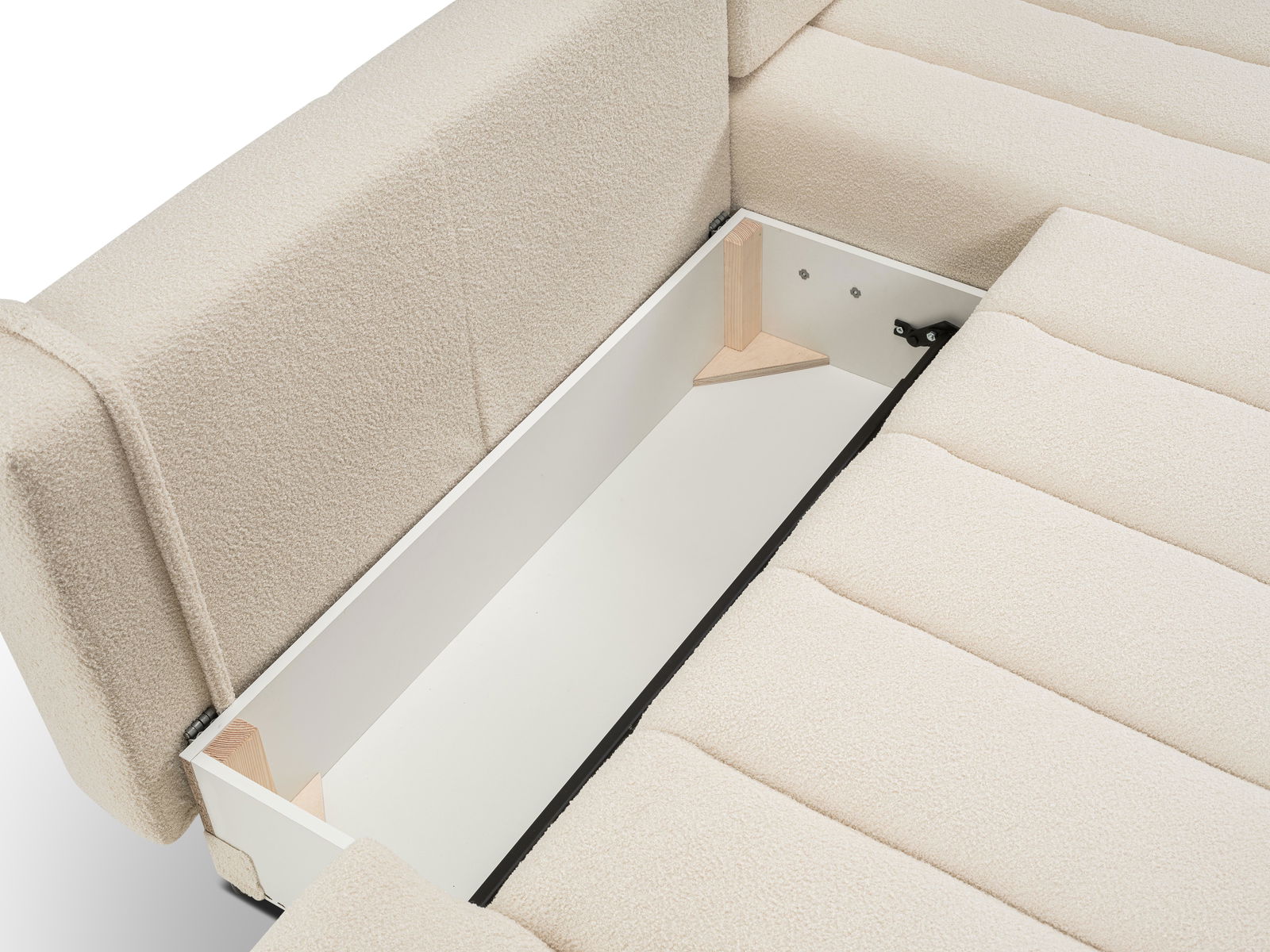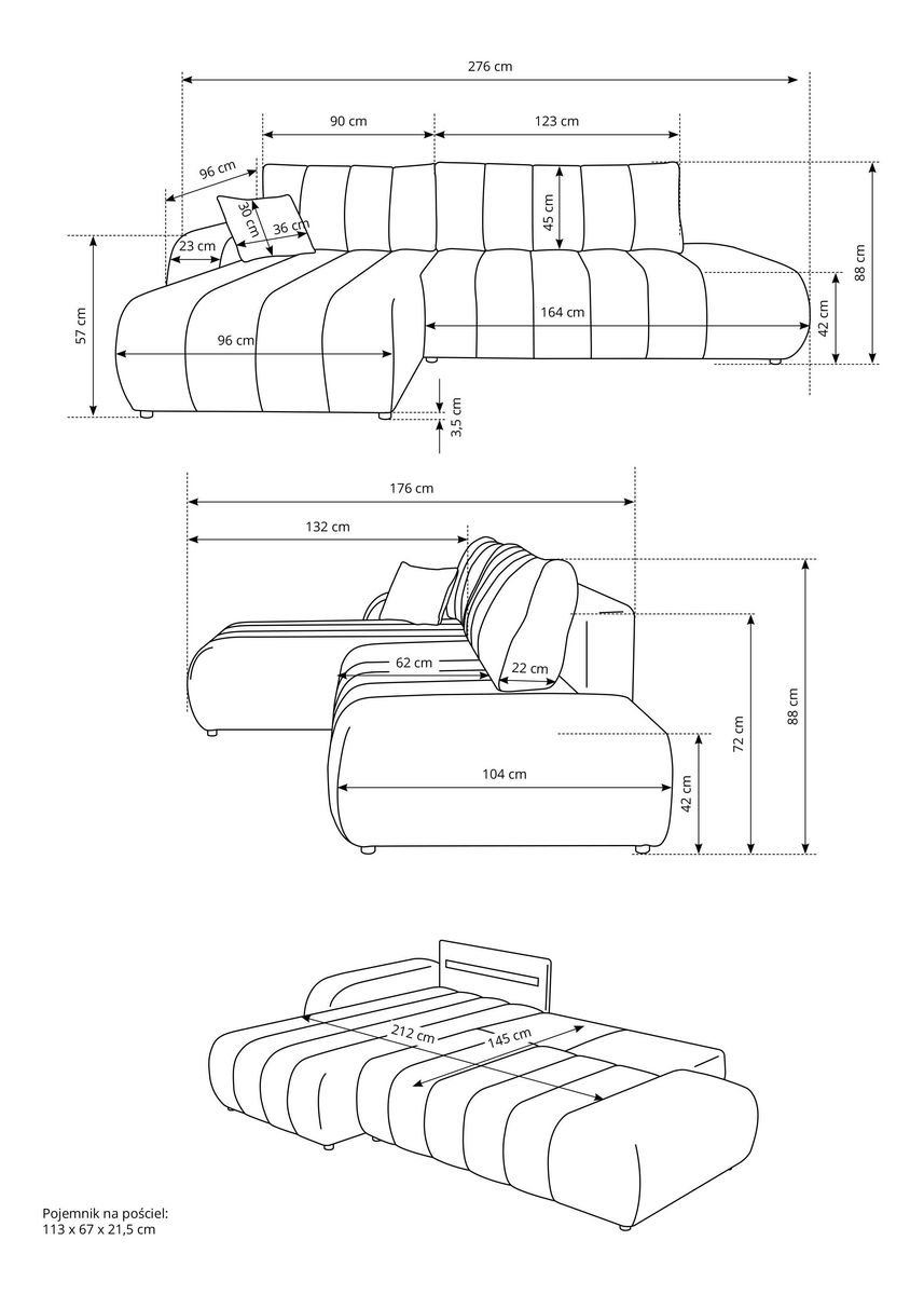 ZobrazitRohová sedačka s konstrukcí z borovicového dřeva, dřevotřísky a překližky nabízí dokonalou kombinaci pohodlí a trvanlivosti. Sedáky jsou vyrobeny z PUR pěny s různou hustotou (T-3042, T-2542 a T-1620), což zaručuje maximální komfort. Sedačka je rozkládací a poskytuje plochu na spaní o rozměrech 145 x 212 cm. Výška sezení je 42 cm, hloubka sezení 61 cm a výška područky 57 cm. Velkorysý úložný prostor má rozměry 113 x 67 x 21,5 cm. Hřbet je potažen stejnou látkou, což zaručuje jednotný vzhled. Sedačka nemá nastavitelné opěrky hlavy ani područky, ale je vybavena plastovými nožičkami o výšce 3,5 cm a typem rozkládání DL automat. Součástí sedačky je také jeden malý polštář. Sedačka je čalouněna kvalitní tkaninou Lambi.