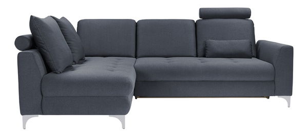 Rohová sedací souprava s rozkládáním Rozkládání je typu delfín s gumovými kolečky pro ochranu podlahy Opěrka hlavy a bederní opěrka pro ergonomické sezení Měkká výplň polštářů pěnou a silikonem pro vyšší komfort Vlnité pružiny v sedáku i v části na spaní Nastavitelné opěradlo Nožky kovové s chromovou úpravou Vysoká opěrný část pro kvalitní oporu zad Doplňkové boční polštáře Zadní část čalouněna