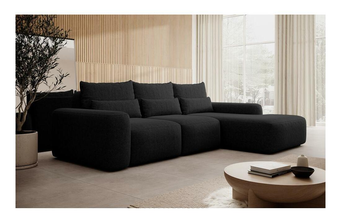 ZobrazitHledáte moderní salonkový nábytek do vašeho obývacího pokoje, kde si po náročném dni pohodlně odpočinete? Rohová sedačka s funkcí spánku bude vynikající volbou Rohová sedačka s funkcí spánku je spojením harmonických zaoblených tvarů s minimalistickým designem a vytváří kus nábytku s mimořádně moderním výrazem. , vyrobený z vysoce kvalitní žinylkové tkaniny, vyzařuje eleganci a pohodlí. Souprava obsahuje vkusné bederní polštáře, které celou rohovou sedačku extra zútulní. není jen styl a estetika, je to také funkčnost přizpůsobená potřebám každodenního života. Rohová pohovka vybavená mechanismem DL se snadno změní na pohodlné místo na spaní. navíc obsahuje praktický zásobník na ložní prádlo, který vám umožní udržovat pořádek v místnosti. Pohodlí sedáku je zdůrazněno použitím vlnových pružin typu B v sedáku, které zajišťují vynikající oporu a rovnoměrné rozložení hmotnosti těla. Rohová pohovka je ideální volbou pro ty, kteří oceňují estetiku i funkčnost ve svém okolí. Přidejte se k revoluci v pohodlném relaxu!Vyberte si rohovou pohovku a objevte nový rozměr relaxu ve svém interiéru!Hledáte něco menšího?Nezapomeňte si prohlédnout naši pohovku ze stejné kolekce !Produkt detaily: rohová sedačka ve tvaru L, nábytek pro pravou ruku, volně stojící model, tj. s čalouněným opěradlem, funkce na spaní typu DL umožňuje velmi rychlé rozložení rohové sedačky, standardně praktický kontejner na lůžkoviny, vlnové pružiny typu B v sedáku, tři bederní polštáře jsou součástí rohové sedačky, čalouněný nábytek látka Melody 15 v černé barvě, Melody je hustá a odolná látka tkaná v ženilkm stylu s čirými uzly připomínajícími půvabnou ovčí vlnu. Jemnost a okouzlující dotek této látky nabízí neuvěřitelný pocit pohodlí. Neuvěřitelná gramáž 480 g/m2 poskytuje komfort, který se mezi jinými látkami jen obtížně hledá.