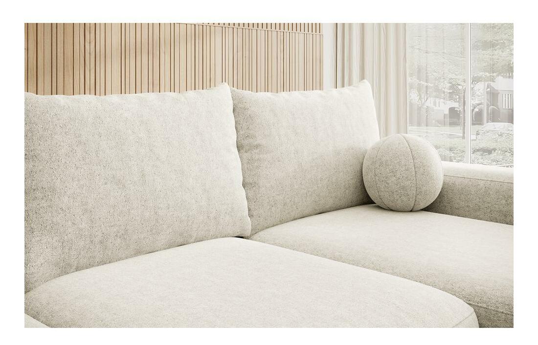 Už vás omrzel masivní, těžký nábytek? Potom Rohová sedačka s funkcí na spaní se ukáže jako hit Rohová sedačka s funkcí na spaní je kombinací harmonických zaoblených tvarů s minimalistickým designem a vytváří kus nábytku s mimořádně moderním výrazem. , vyroben z kvalitní žinylkové látky, vyzařuje eleganci a pohodlí. Souprava obsahuje vkusné polštáře na opěradlo a jeden nevšední v podobě koule, které dodávají celé rohové sedačce jedinečný vzhled. není jen styl a estetika, je to také funkčnost přizpůsobená potřebám každodenního života. Rohová pohovka, vybavená mechanismem DL, se snadno změní na pohodlné místo na spaní. Pohodlí sedáku je zdůrazněno použitím vlnových pružin typu B v sedáku, které zajišťují vynikající oporu a rovnoměrné rozložení hmotnosti těla. Rohová pohovka je ideální volbou pro ty, kteří oceňují estetiku i funkčnost ve svém okolí. Přidejte se k revoluci v pohodlném relaxu!Vyberte si rohovou pohovku a objevte nový rozměr relaxu ve svém interiéru!Hledáte něco menšího?Nezapomeňte si prohlédnout naši pohovku ze stejné kolekce !Produkt detaily: rohová sedačka ve tvaru L, nábytek pro pravou ruku, volně stojící model, tj. s čalouněným opěradlem, funkce spánku typu DL umožňuje velmi rychlé rozložení rohové sedačky, standardně praktický kontejner na lůžkoviny, vlnité pružiny typu B v sedáku, v ceně dekorační polštářek v podobě míčku, nábytek čalouněný látkou Melody 14 v krémové barvě, Melody je hustá a odolná látka tkaná v ženilkm stylu, s čirými uzly připomínajícími ladnou ovčí vlnu. Jemnost a okouzlující dotek této látky nabízí neuvěřitelný pocit pohodlí. Neuvěřitelná gramáž 480 g/m2 poskytuje komfort, který se mezi jinými látkami jen obtížně hledá.