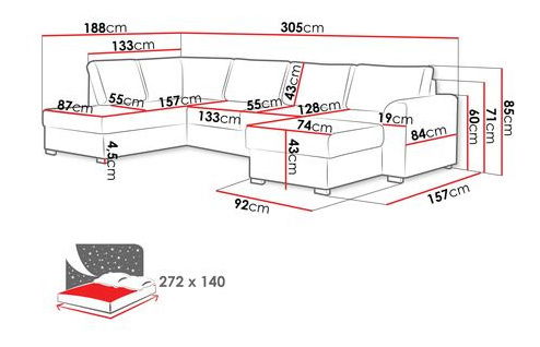 ZobrazitSedací souprava je ideální volbou pro ty, kteří hledají pohodlí a styl. Szafran je módní a praktická sedací souprava s funkcí spánku. Široký výběr barev potahových látek znamená, že je můžete snadno přizpůsobit vašemu zařízení. Rohová sedačka se snadno rozloží a poskytuje velký prostor pro spaní, který lze využívat každý den. Samozřejmě lze využít i jako lůžko pro návštěvy. Další výhodou sedačky jsou dva úložné prostory na ložní prádlo, jejich optimální velikost umožňuje i skladování sezónního oblečení a jiného zřídka používaného příslušenství. Rozměry: délka: 305 cm, šířka: 188 cm, výška: 85 cm, plocha na spaní: 272 x 140 Strana sedací soupravy: levá nebo pravá Provedení: konstrukce sedáku: dřevěný rám + falista pružina + plst + pěna T1 HDF deska + 1 cm silná T2844 pěna, funkce rozkladu, funkce spaní, sedací souprava ve tvaru U, s úložným prostorem, polštáře v ceně (6 velkých) - na zip, dřevěné nohy (tmavý ořech), volně stojící sedací souprava (čalouněná látkou)4 Záruka
