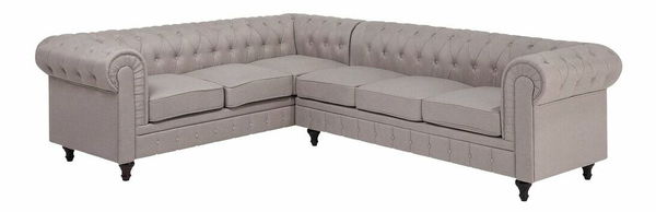 Tato rohová pohovka se vyznačuje elegantní siluetou se širokými zaoblenými rameny, která je charakteristická pro design Chesterfield a hodí se do každého moderního nebo tradičně zařízeného interiéru. Lehátko je umístěno na pravé straně z pohledu sedící osoby. Nízké opěradlo, tlusté čalouněné sedátko a nohy z eukalyptového dřeva nabízejí ten nejlepší komfort a stabilitu. Díky snímatelným potahům na polštářích je čištění případných skvrn jednodušší. Kvalitní látkové čalounění v nadčasové béžové je zvýrazněno klasickým prošíváním s knoflíčky. Tato anglická klasika se snadno udržuje a bude vypadat úžasně v tradičně zařízeném nebo moderním interiéru.