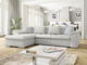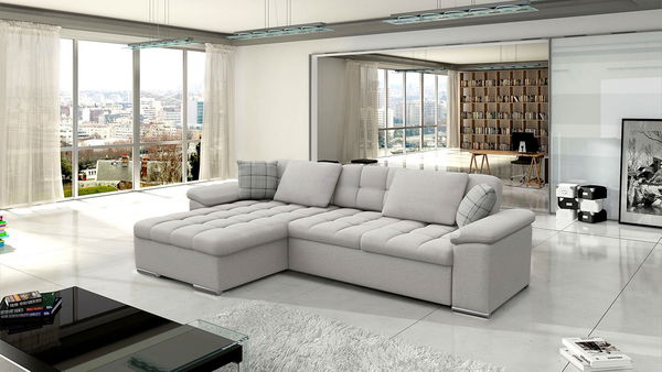 Moderní styl, ve kterém byla vyrobena rozkládací rohová pohovka Dante, se vyznačuje prošívaným sedákem, opěradlem a klasickými barvami. Prvky z ekokůže jí dodávají elegantní vzhled. Moderní rohová pohovka do obývacího pokoje má funkci spaní a nádobu na ložní prádlo. Zadní část rohové pohovky je čalouněna látkou, což z ní činí samostatně stojící kus nábytku. Kromě toho si můžete vybrat stranu rohové pohovky (levou nebo pravou). Rozkládací pohovka do obývacího pokoje má tvar písmene L. Díky vysoce elastické pěně a vlnovým pružinám použitým v sedadle je jeho používání velmi pohodlné. Na to mají vliv i polštáře, které jsou součástí rohové pohovky Dante.