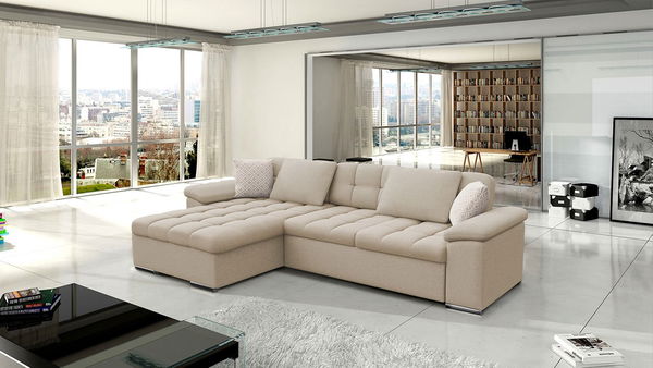 Moderní styl, ve kterém byla vyrobena rozkládací rohová pohovka Dante, se vyznačuje prošívaným sedákem, opěradlem a klasickými barvami. Prvky z ekokůže jí dodávají elegantní vzhled. Moderní rohová pohovka do obývacího pokoje má funkci spaní a nádobu na ložní prádlo. Zadní část rohové pohovky je čalouněna látkou, což z ní činí samostatně stojící kus nábytku. Kromě toho si můžete vybrat stranu rohové pohovky (levou nebo pravou). Rozkládací pohovka do obývacího pokoje má tvar písmene L. Díky vysoce elastické pěně a vlnovým pružinám použitým v sedadle je jeho používání velmi pohodlné. Na to mají vliv i polštáře, které jsou součástí rohové pohovky Dante.
